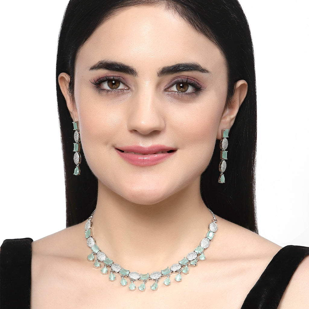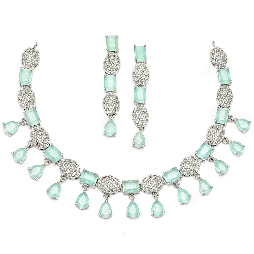 Rhodium-Plated Sea Green American Diamond Studded Intriguing Necklace & Earrings Jewellery Set