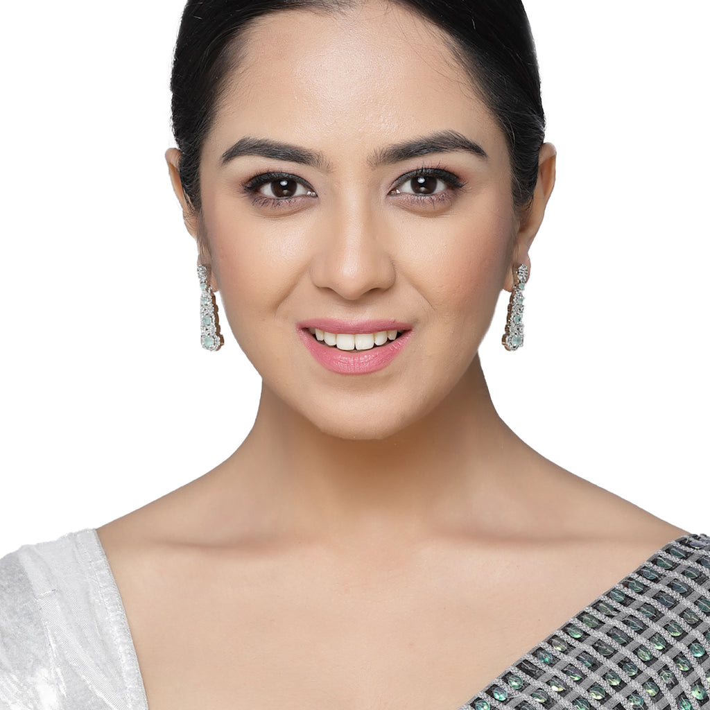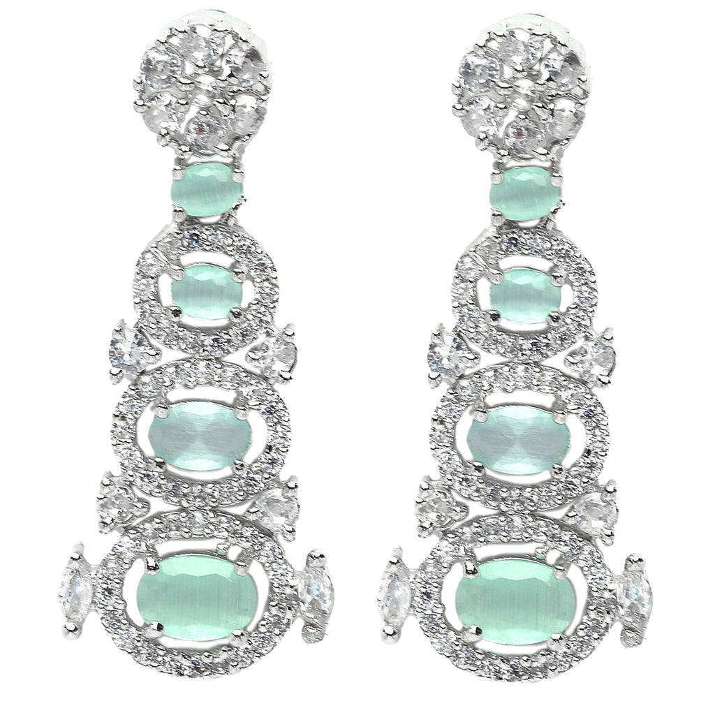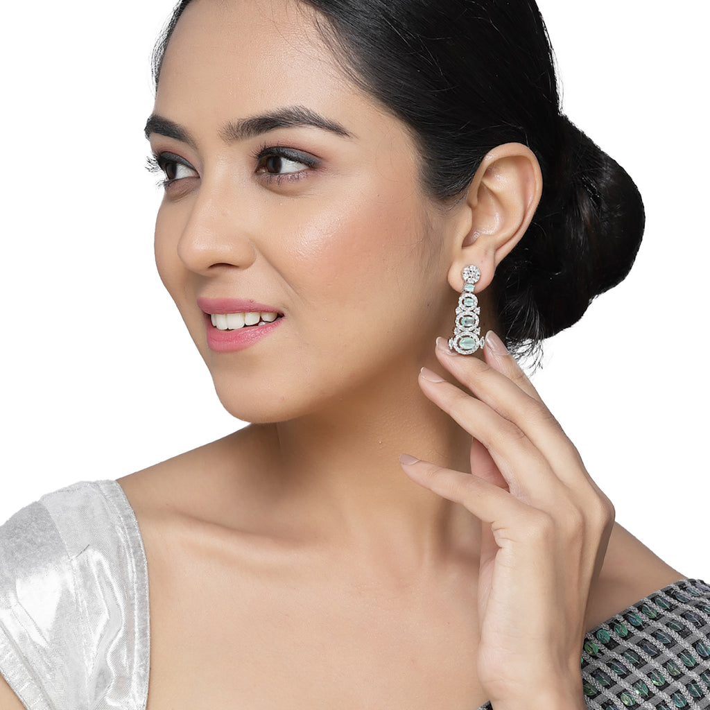 Rhodium-Plated Sea Green American Diamond studded Quirky Shaped Drop Earrings