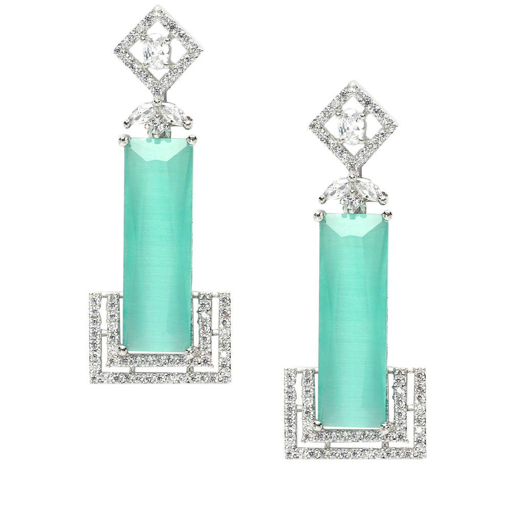 Rhodium-Plated Sea Green American Diamond studded Rectangular Shaped Drop Earrings