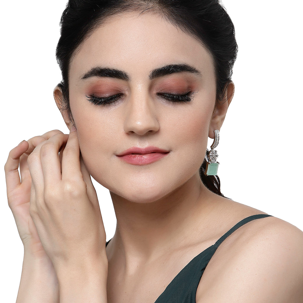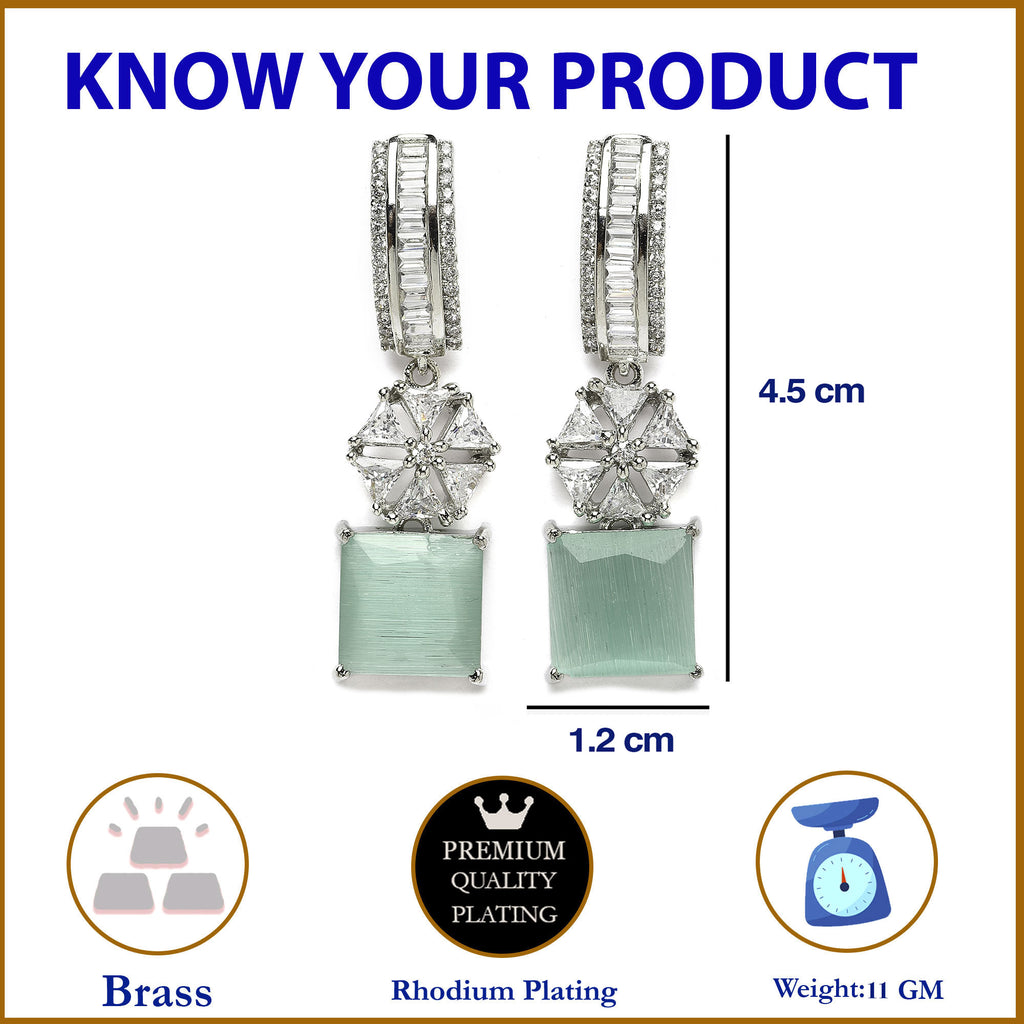 Rhodium-Plated with Silver-Toned Sea Green & White Square & Floral Shaped Drop Earrings, has American Diamond studded secured with a post and back.