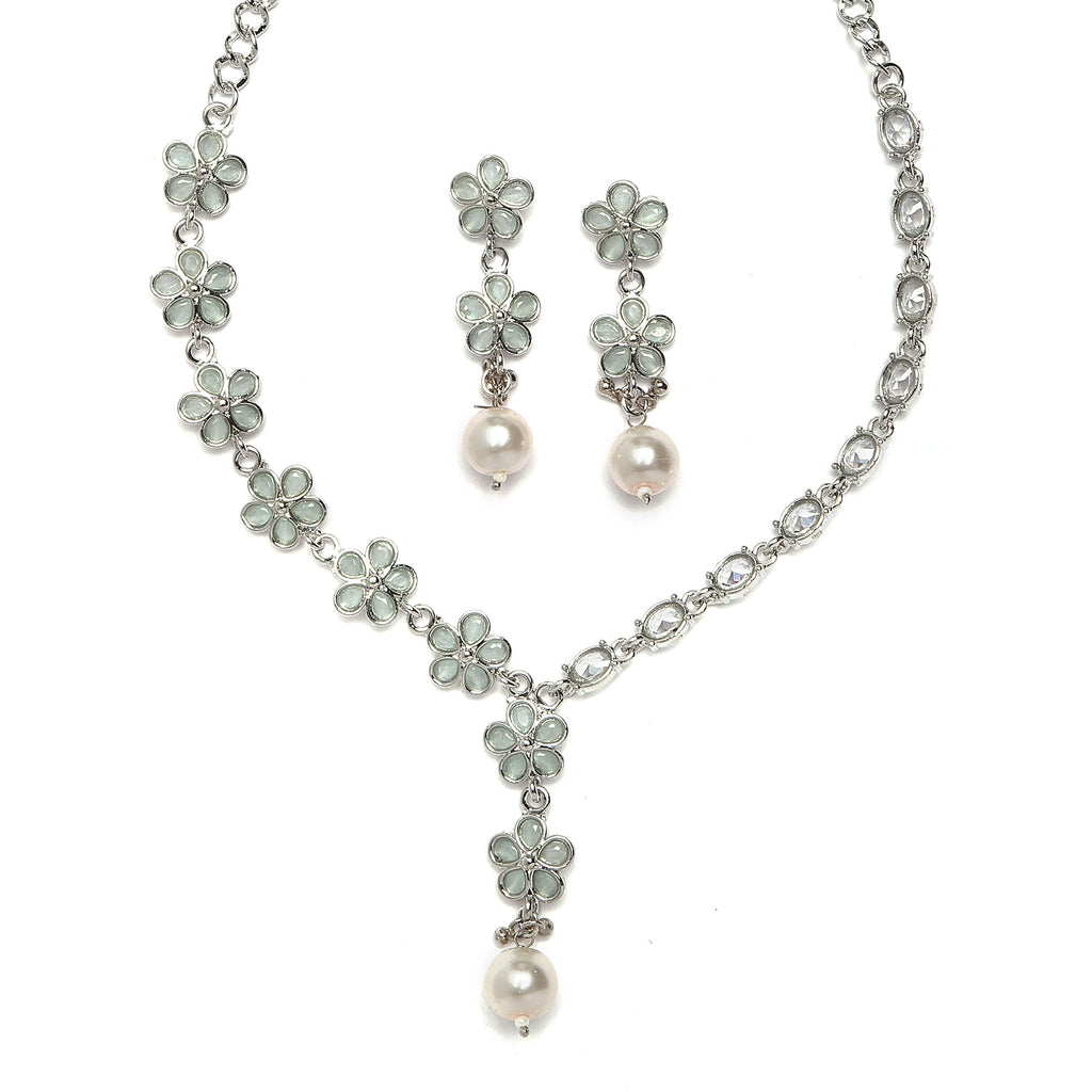 Rhodium-Plated Sea Green American Diamond & White Pearl Studded Floral Necklace & Earrings Jewellery Set