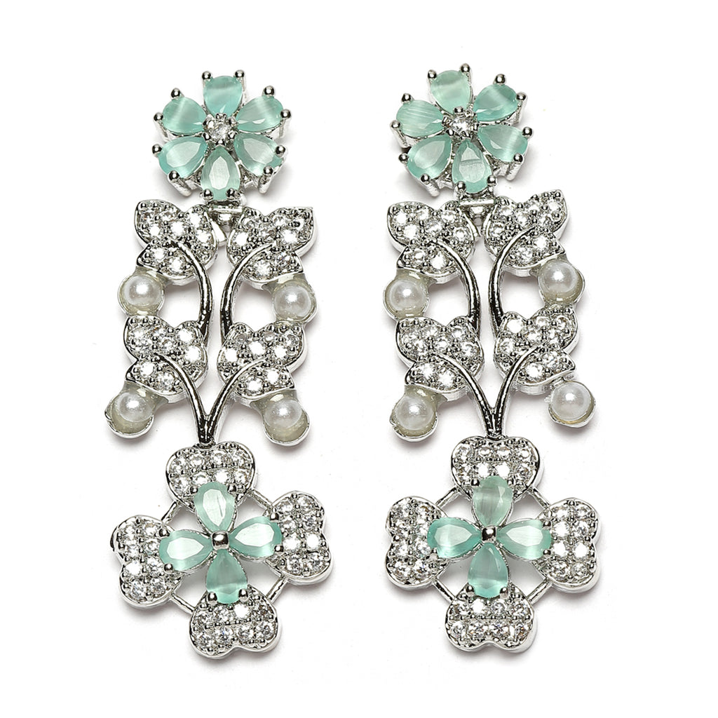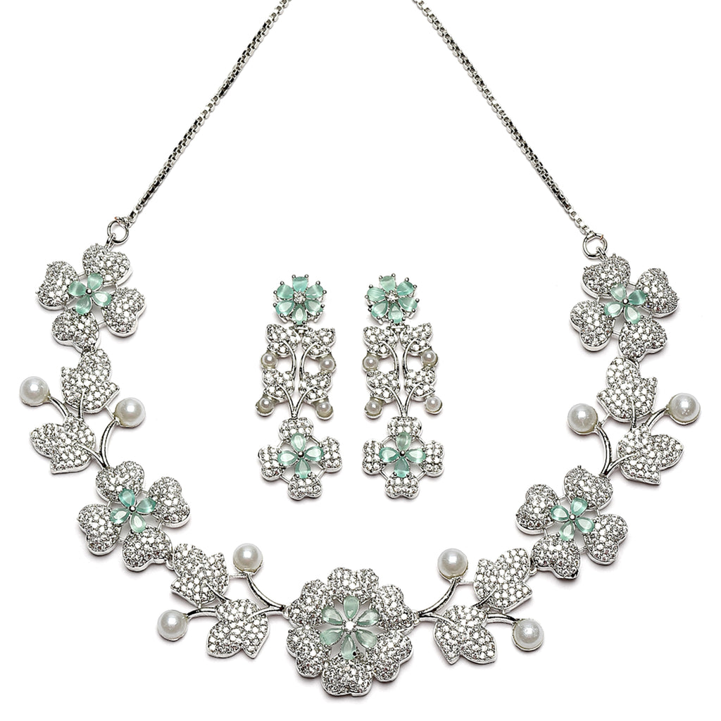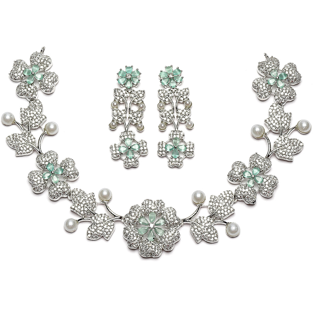 Rhodium-Plated Sea Green Cubic Zirconia Studded Floral Theme Necklace & Earrings Jewellery Set