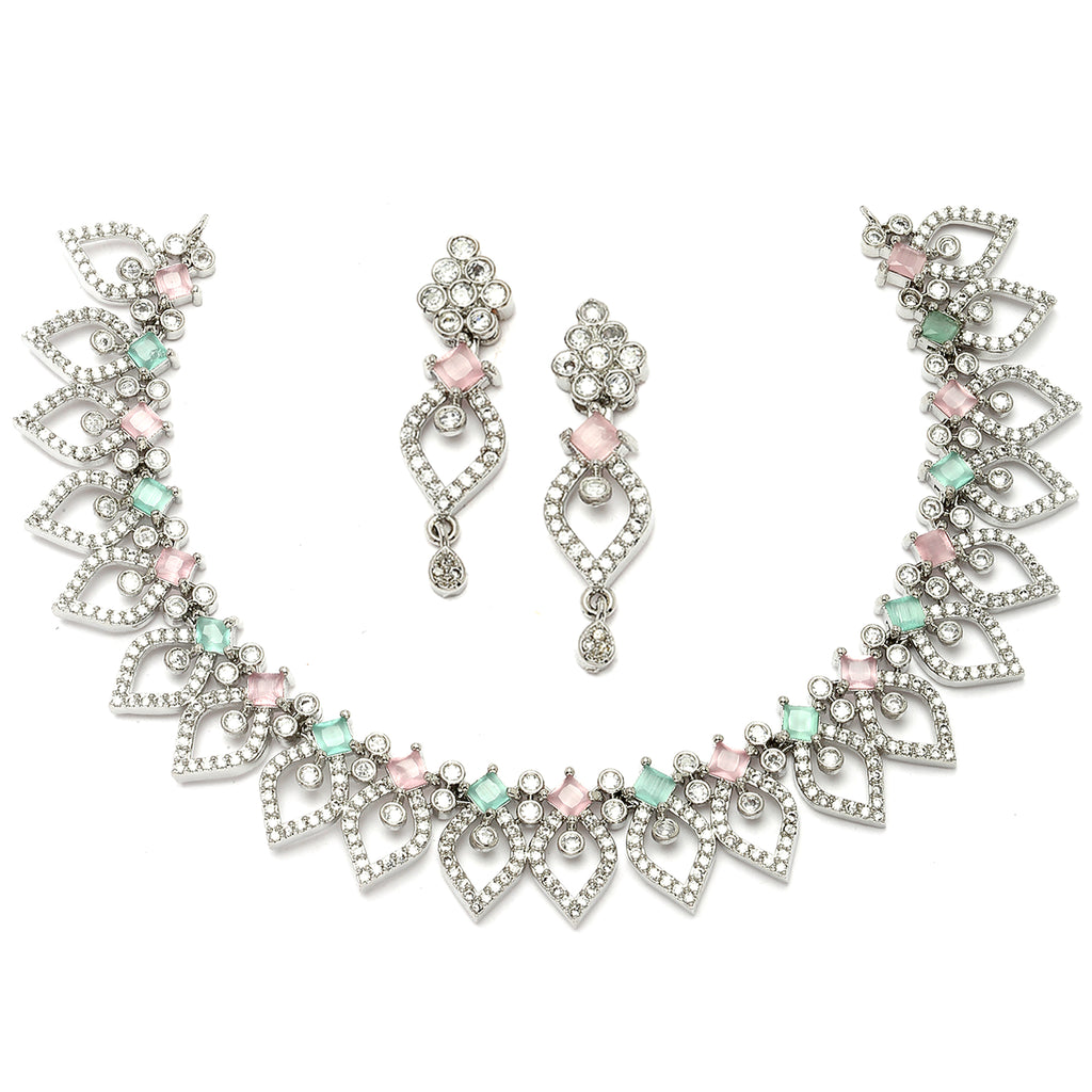 Rhodium-Plated Sea Green & Pink American Diamond Studded Floral & Leaf Shaped Necklace with Earrings Jewellery Set