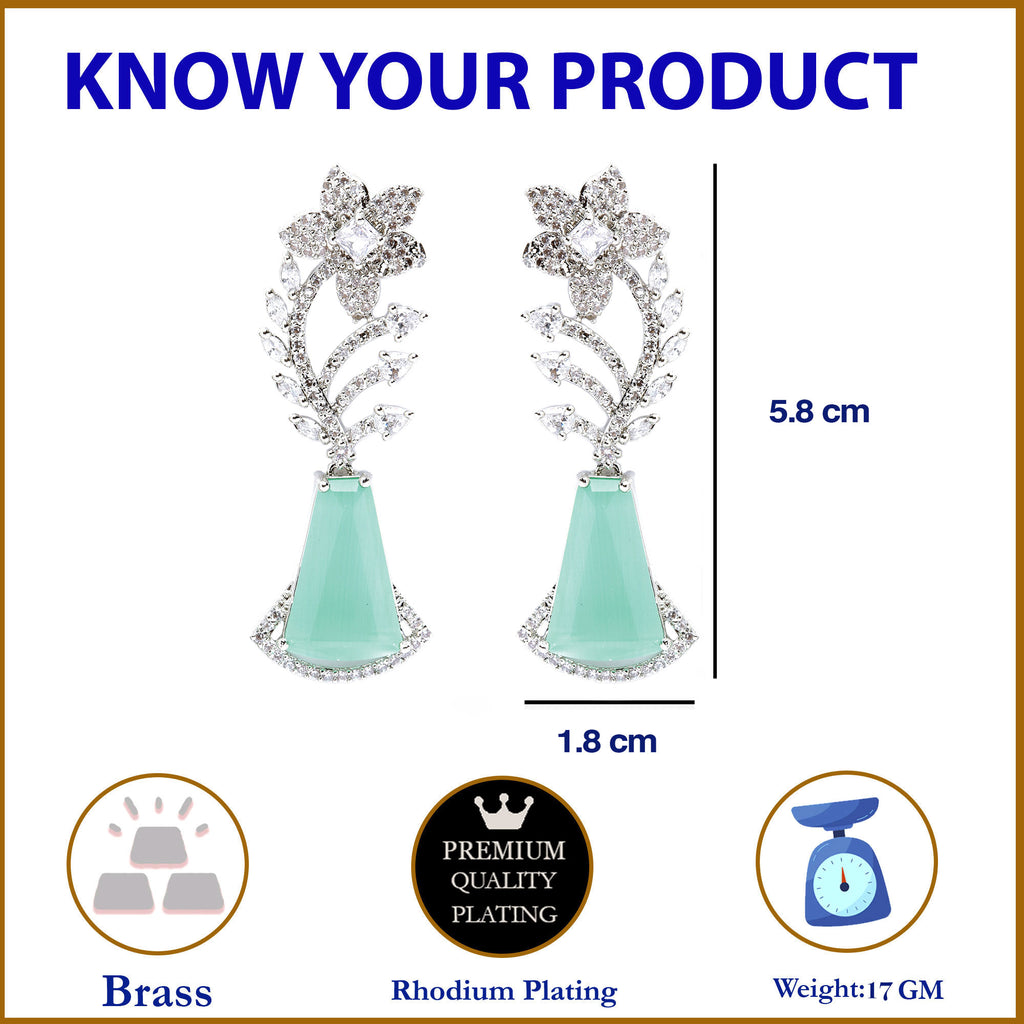 Rhodium-Plated with Silver-Toned Sea Green & White Floral Theme Drop Earrings, has American Diamond studded secured with a post and back.