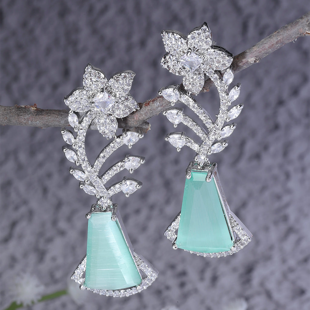 Rhodium-Plated Sea Green & White American Diamond studded Floral Theme Drop Earrings