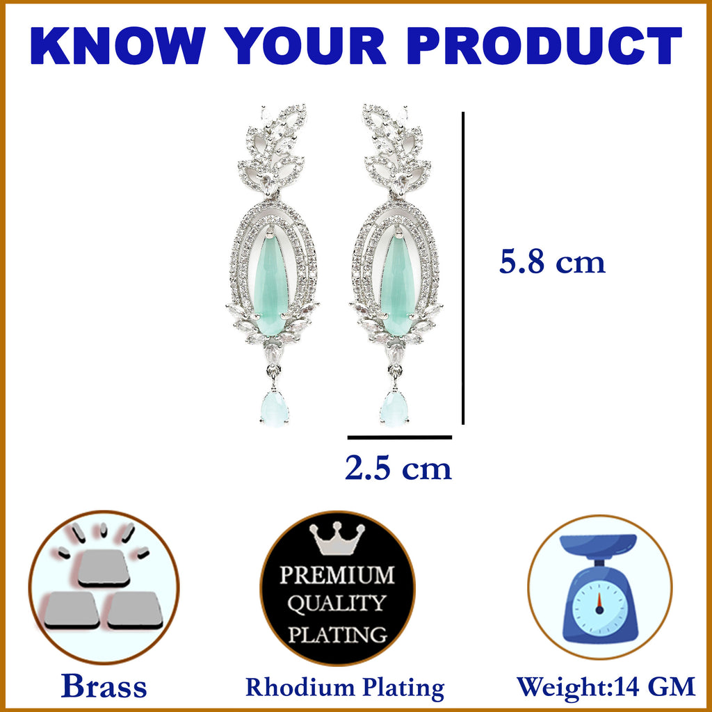 Rhodium-Plated Sea Green & White American Diamond studded Handcrafted Teardrop Shaped Drop Earrings