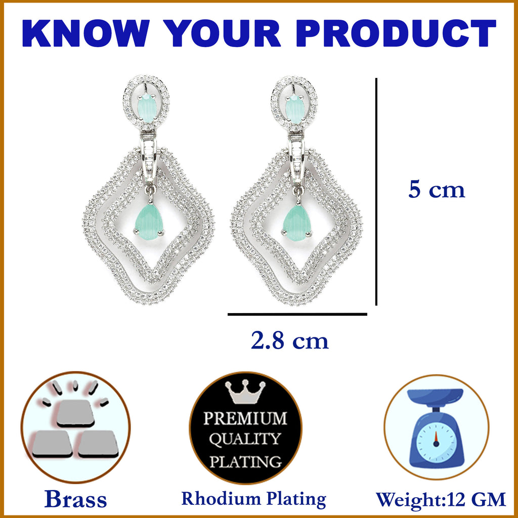 Rhodium-Plated with Silver-Toned Sea Green & White Layered Drop Earrings, has American Diamond studded secured with a post and back.
