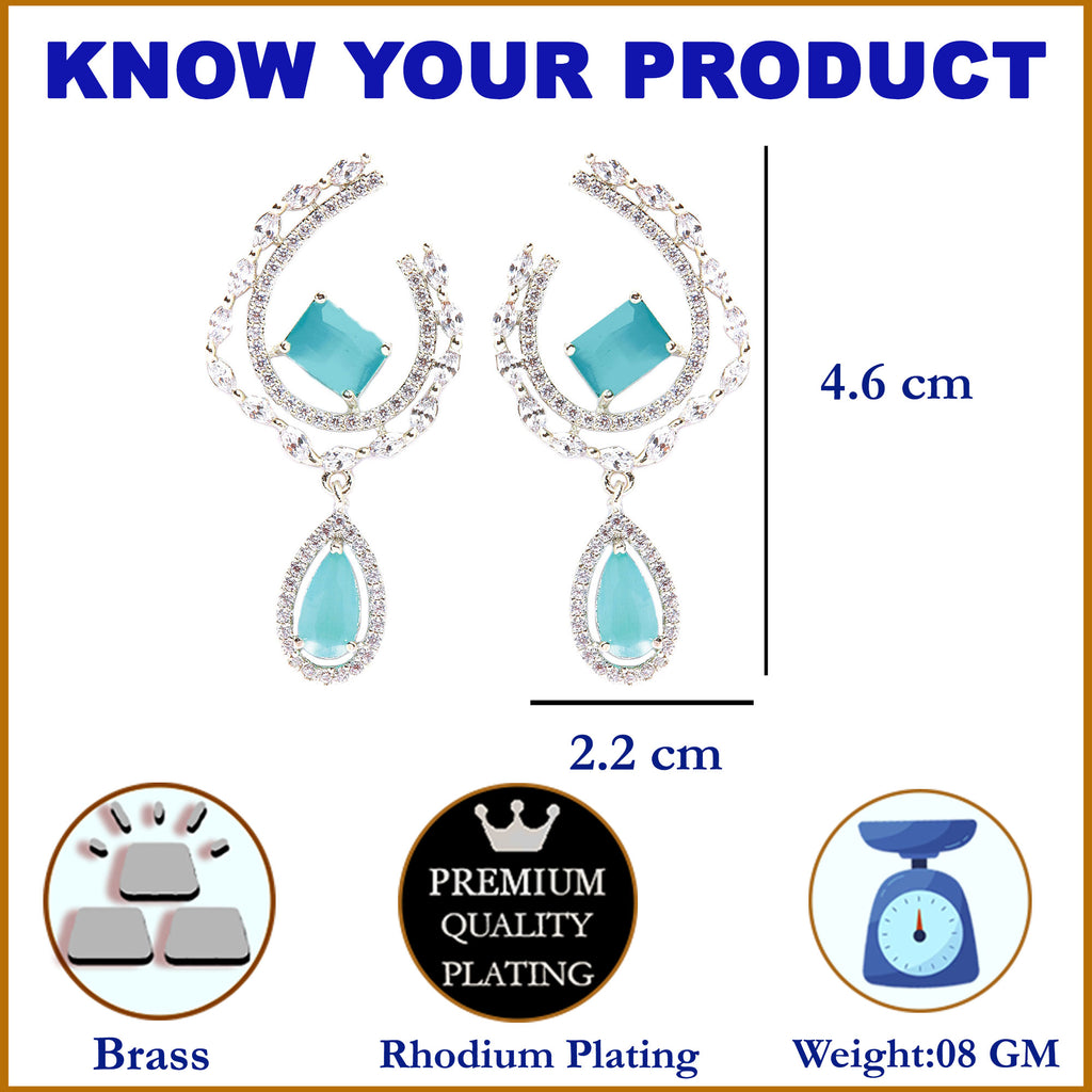 Rhodium-Plated Sea Green & White American Diamond studded Quirky Shaped Drop Earrings