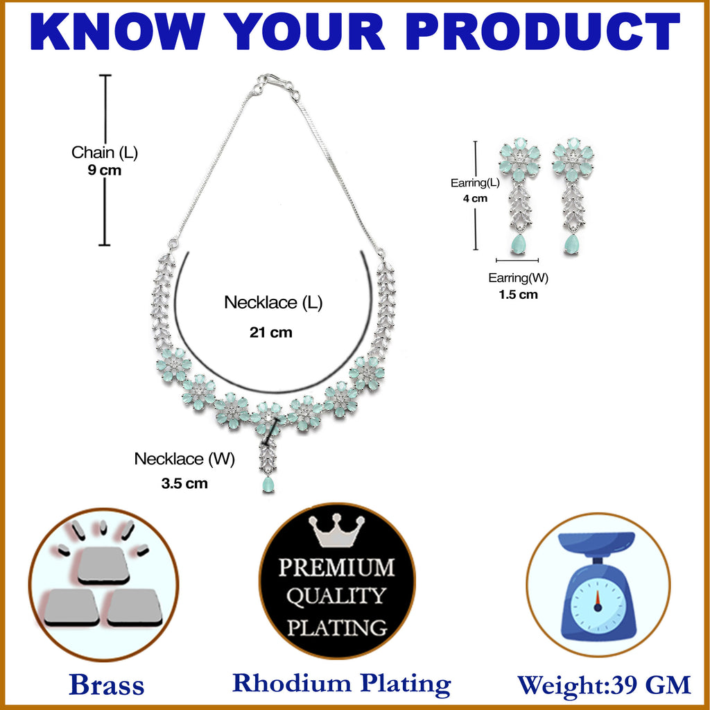 Rhodium-Plated Silver Toned Flower Sea Green American Diamond Studded Necklace with Earring Jewellery Set
