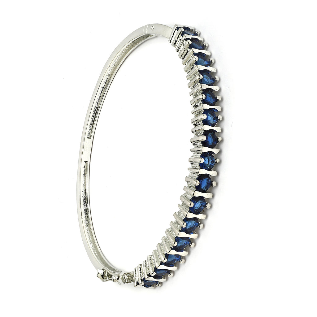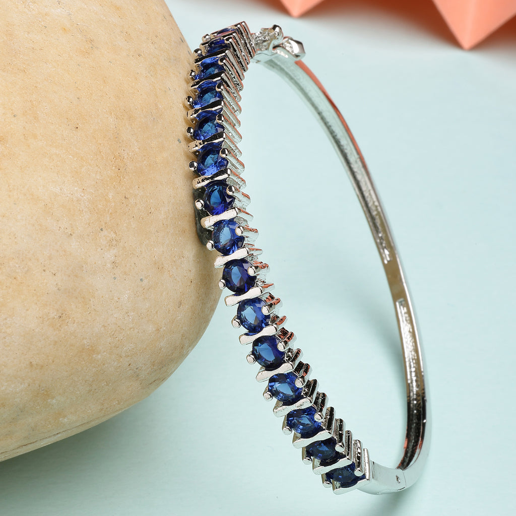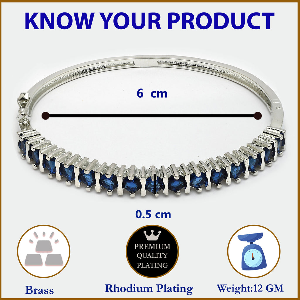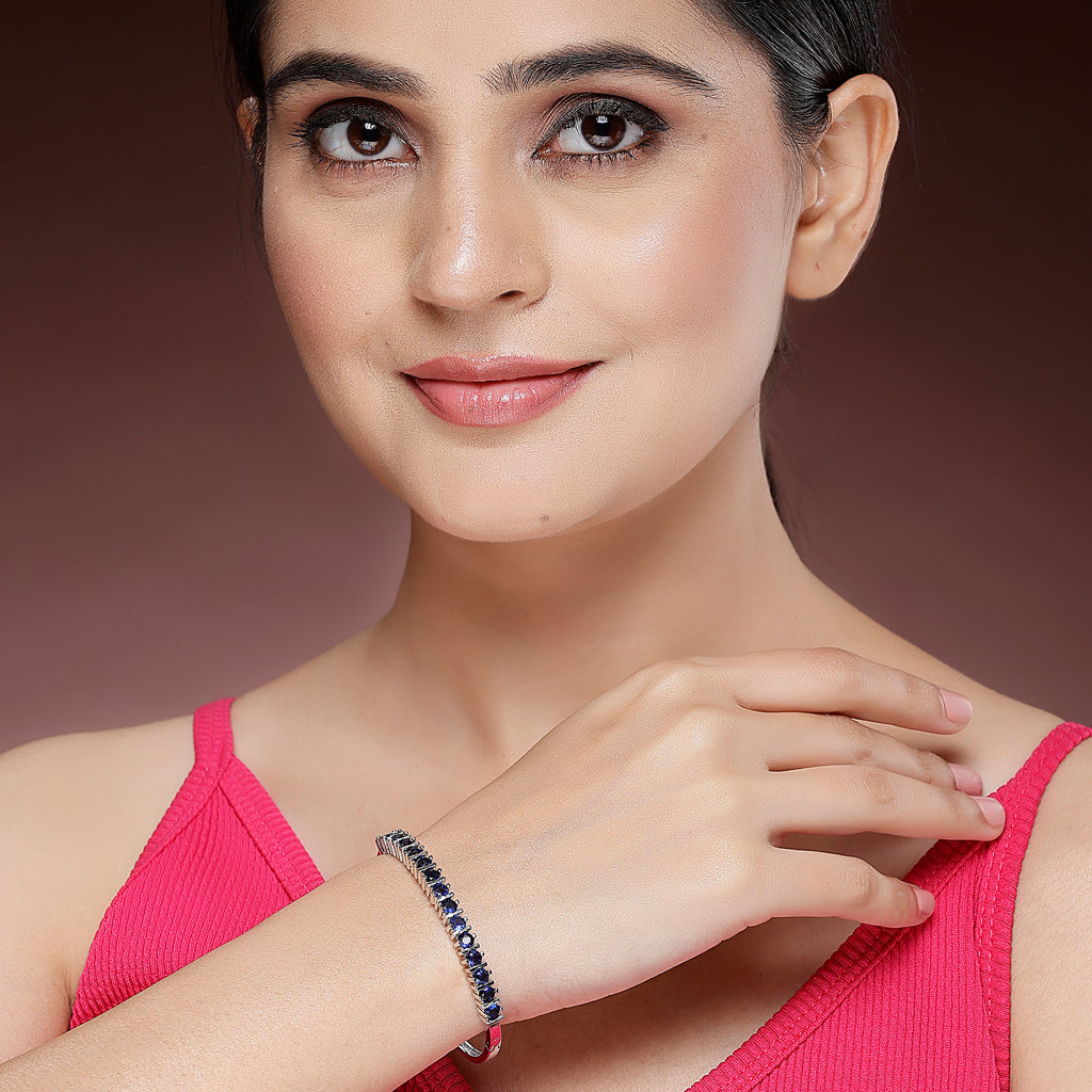 Elegant Design: This rhodium-plated bracelet showcases a stylish design adorned with blue American diamonds, adding a refined and vibrant touch to your look.