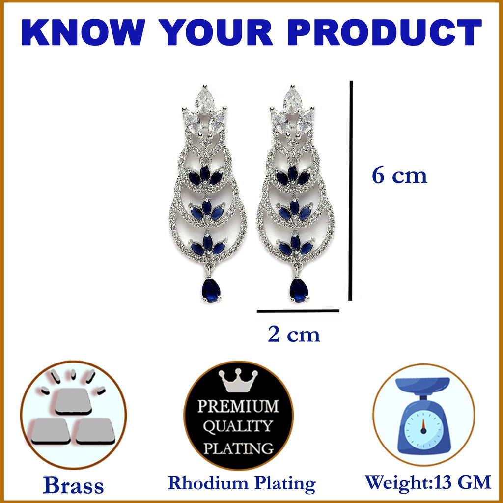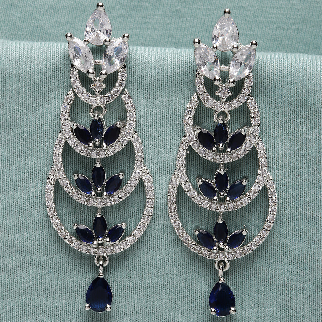 Rhodium-Plated with Silver Toned Blue & White crescent shape drop earrings, has American Diamond studded secured with a post and back.