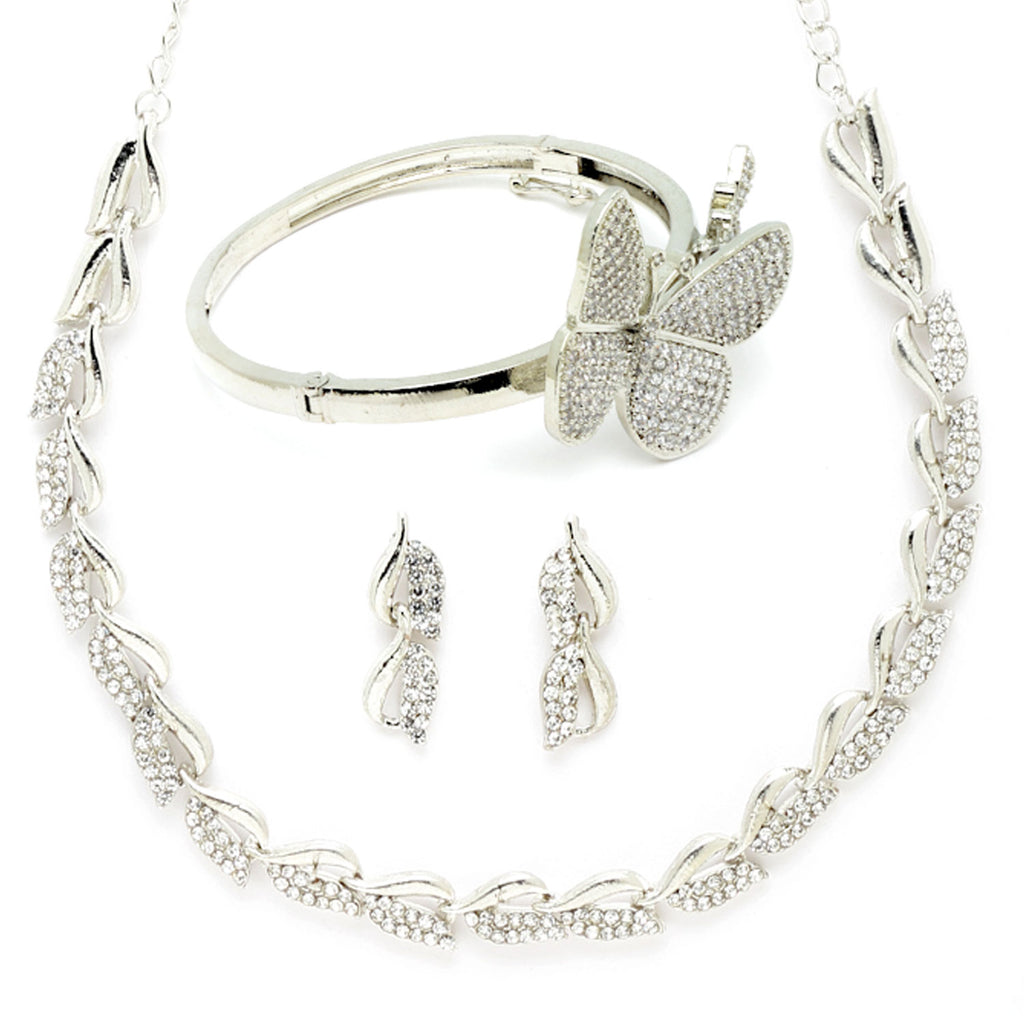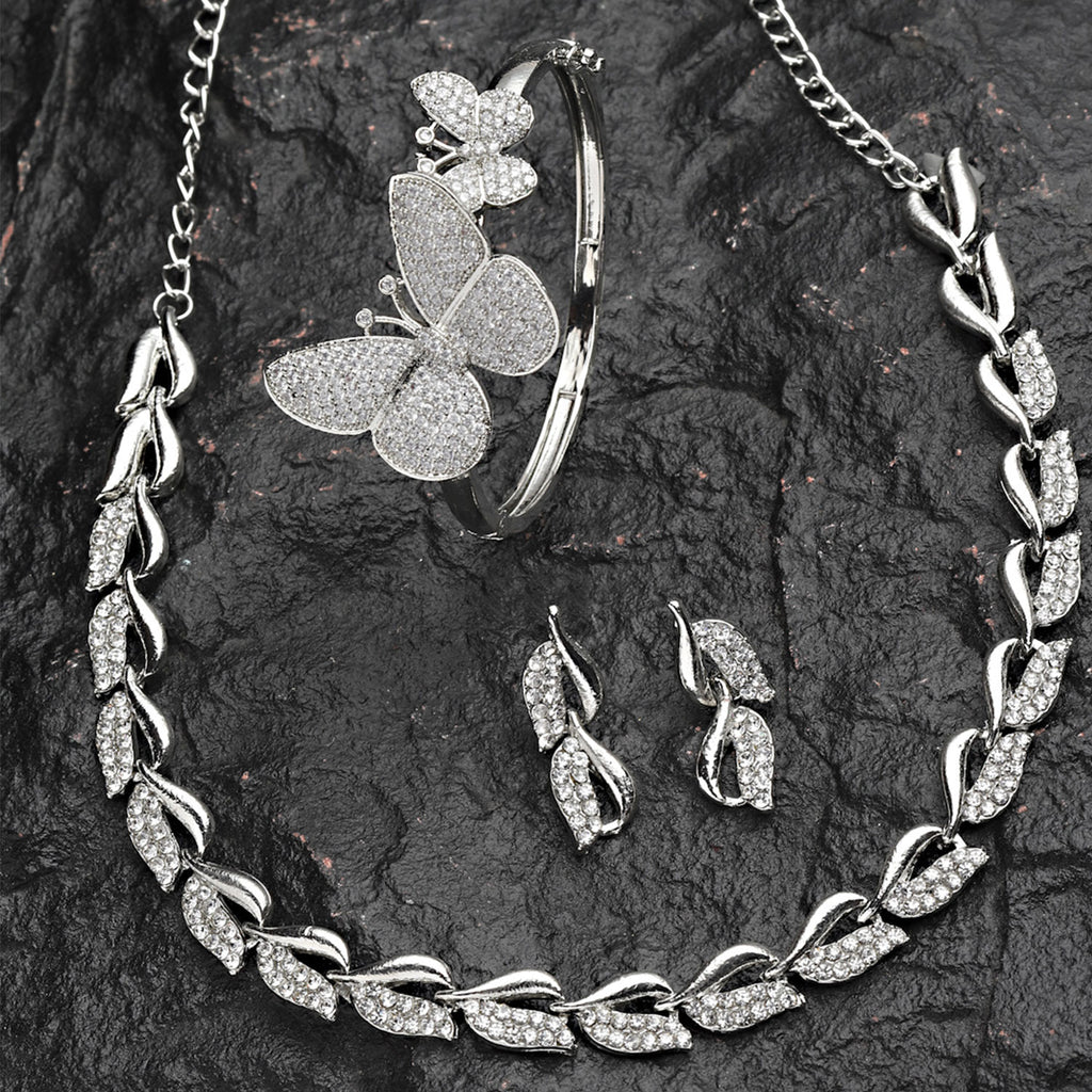 Rhodium Plated Silver Toned Butterfly White Cubic Zirconia Studded Jewellery Set Combo