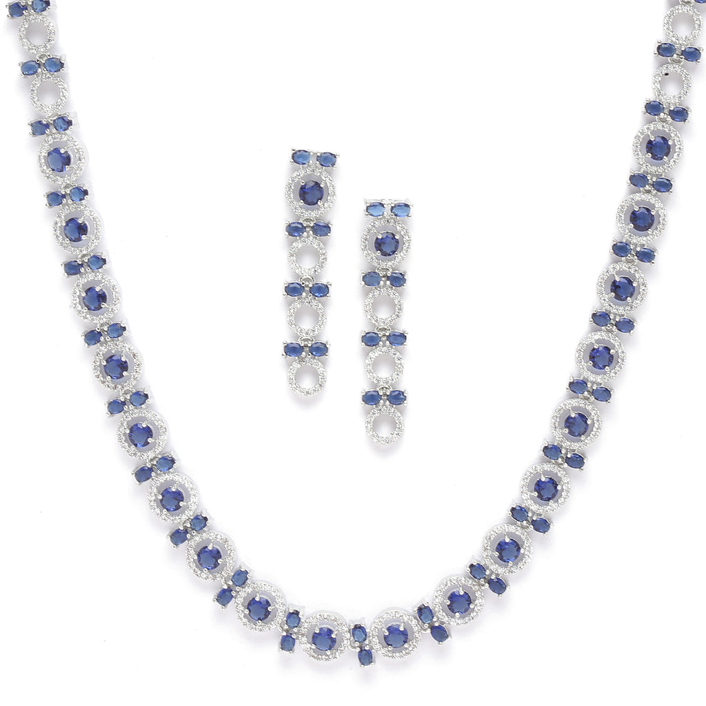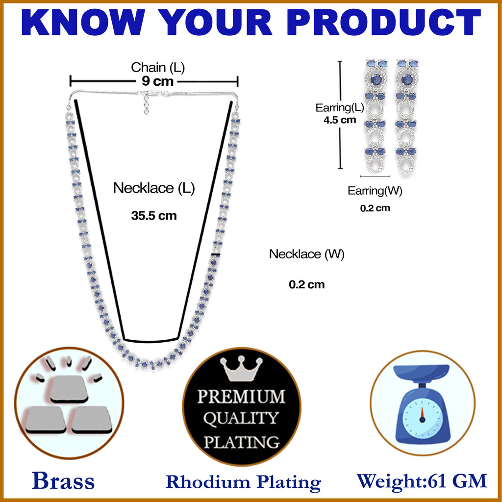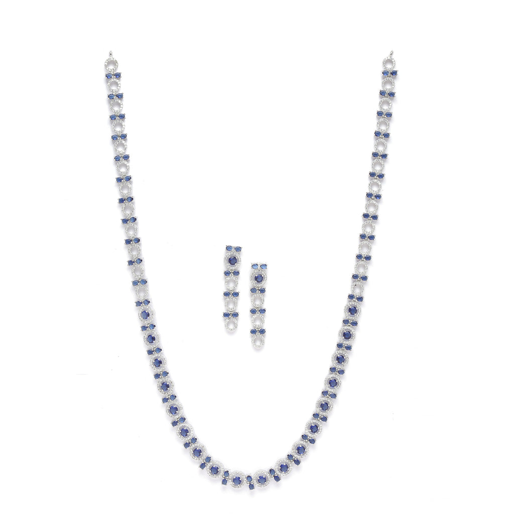 Rhodium-Plated Silver Toned Circular Navy Blue American Diamond Long Necklace with Earrings Jewellery Set