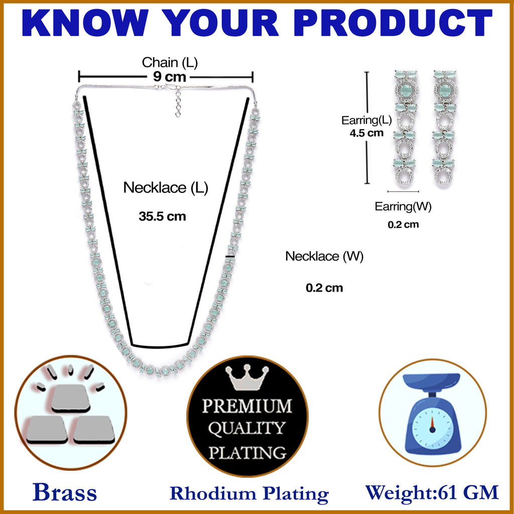 Rhodium-Plated Silver Toned Circular Sea Green American Diamond Long Necklace with Earrings Jewellery Set