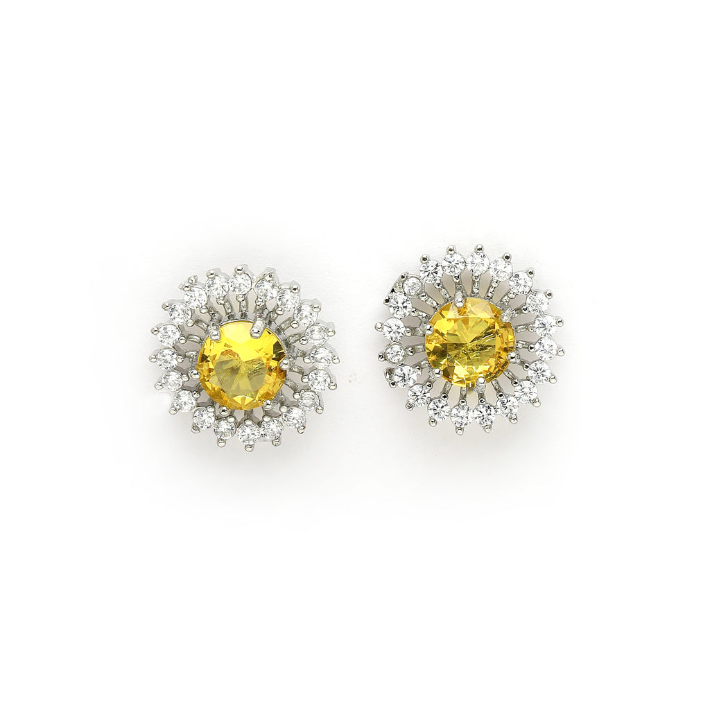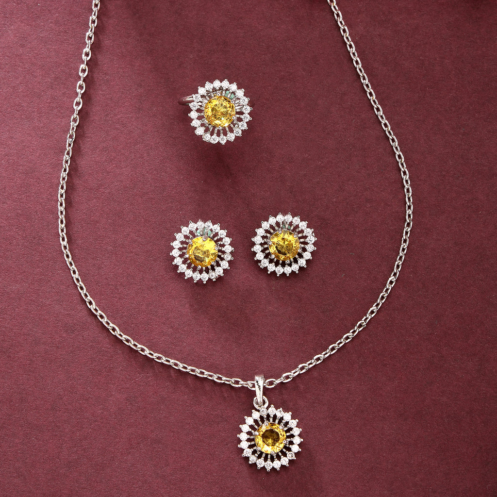 Elegant Design : This rhodium-plated with Yellow gemstone at its core for a harmonized and stylish look. Surrounding the gemstone is a halo of shimmering white stones, adding a touch of brilliance and sophistication