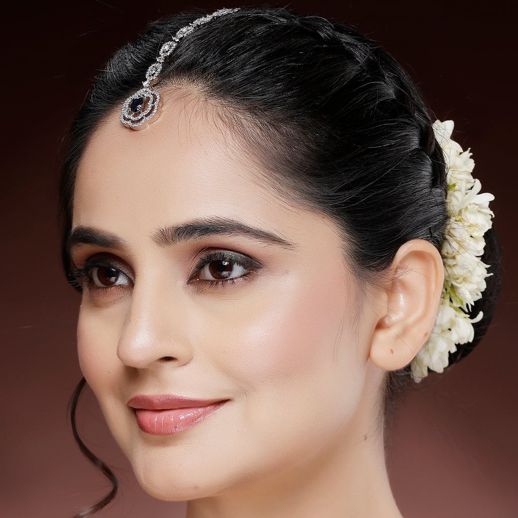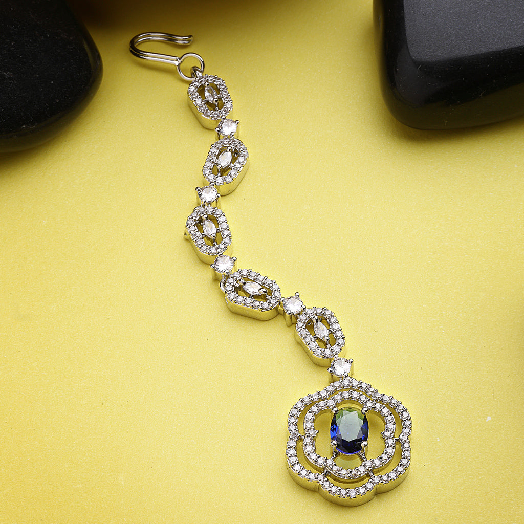 Rhodium Plated Silver Toned Floral Blue American Diamond Studded Maang Tikka