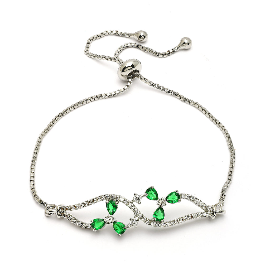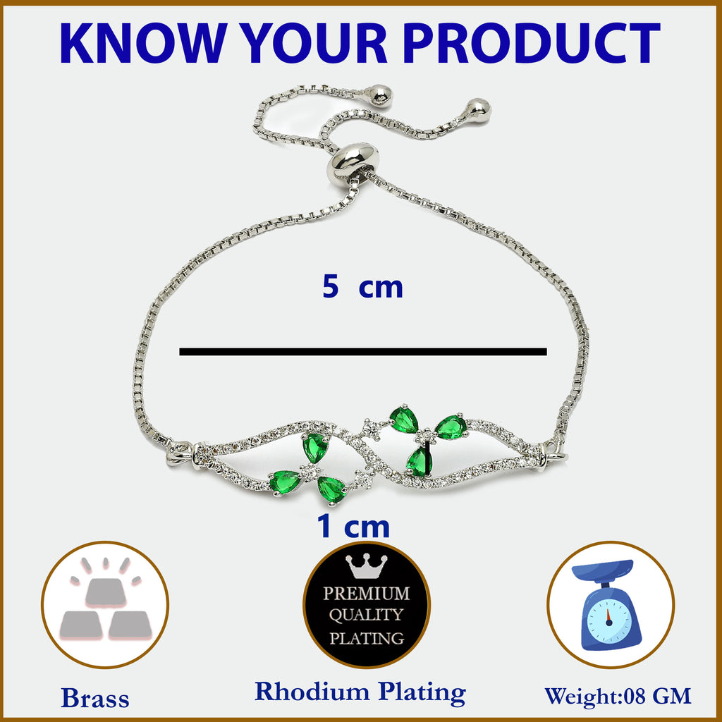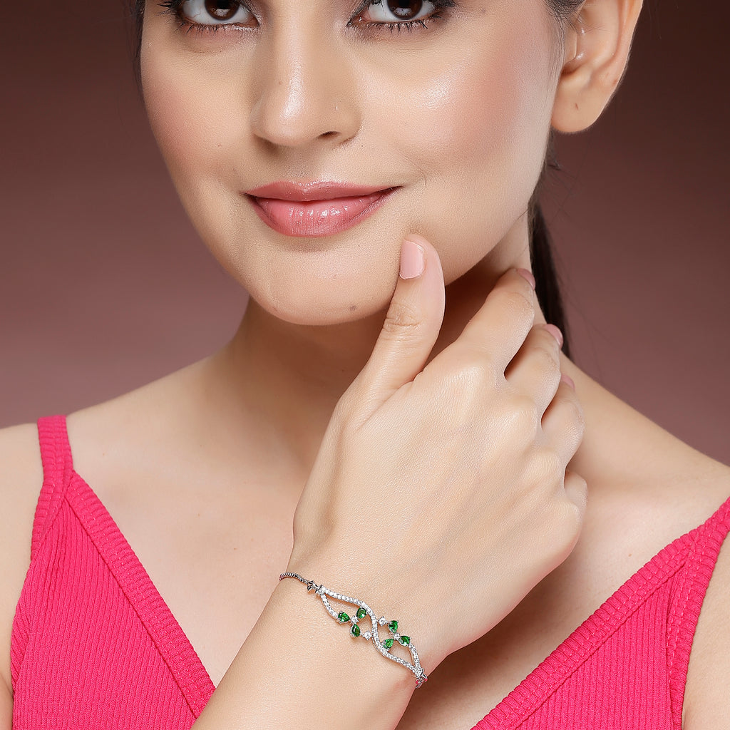 Elegant Design: This rhodium-plated bracelet features a delicate and elegant design with a curving line embellished with sparkling green & white American diamonds. The intricate arrangement of the diamonds gives it a sophisticated and luxurious look.