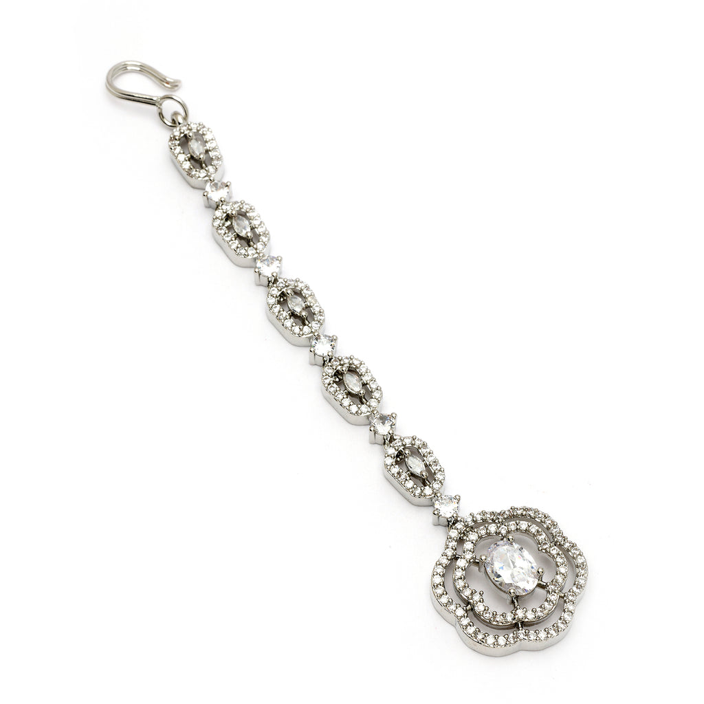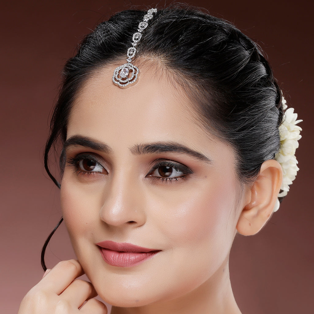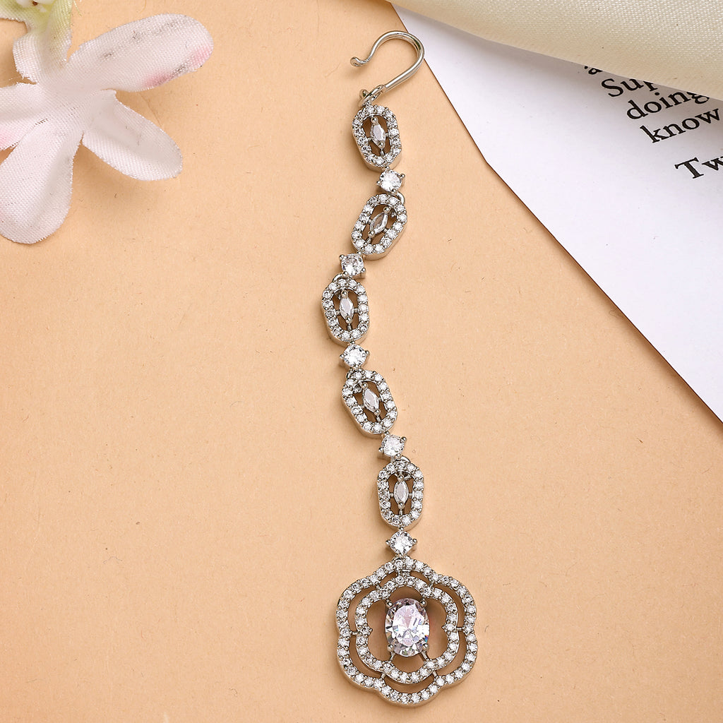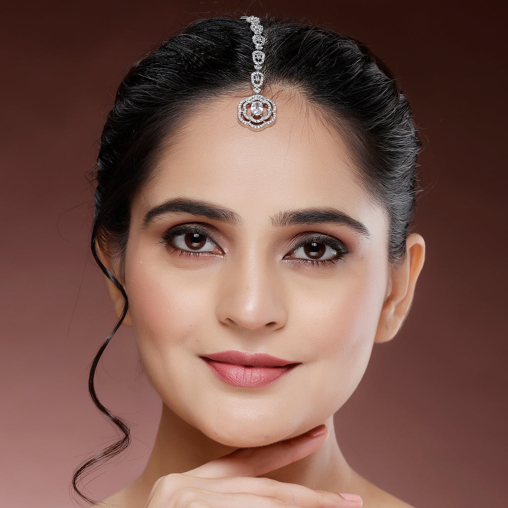 Elegant Design: This rhodium-plated Maang Tikka features a beautiful floral-inspired design, adorned with sparkling stones for a timeless and sophisticated look.