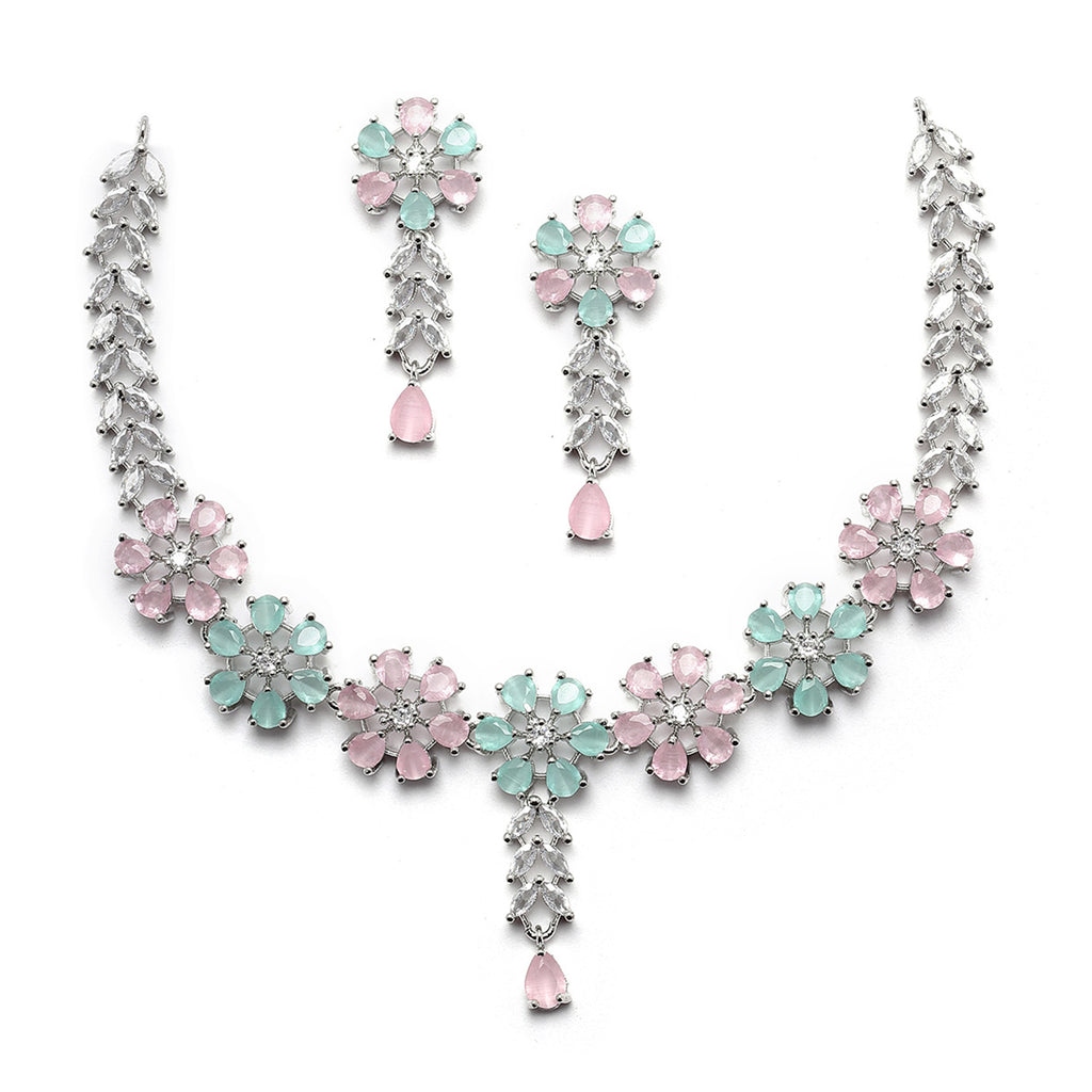Rhodium-Plated Silver Toned Flower Sea Green & Pink American Diamond Studded Necklace with Earring Jewellery Set