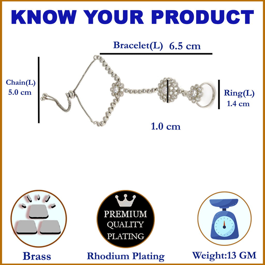 Rhodium Plated Silver Toned Flower White American Diamond Studded Hand Chain Link Ring Bracelet
