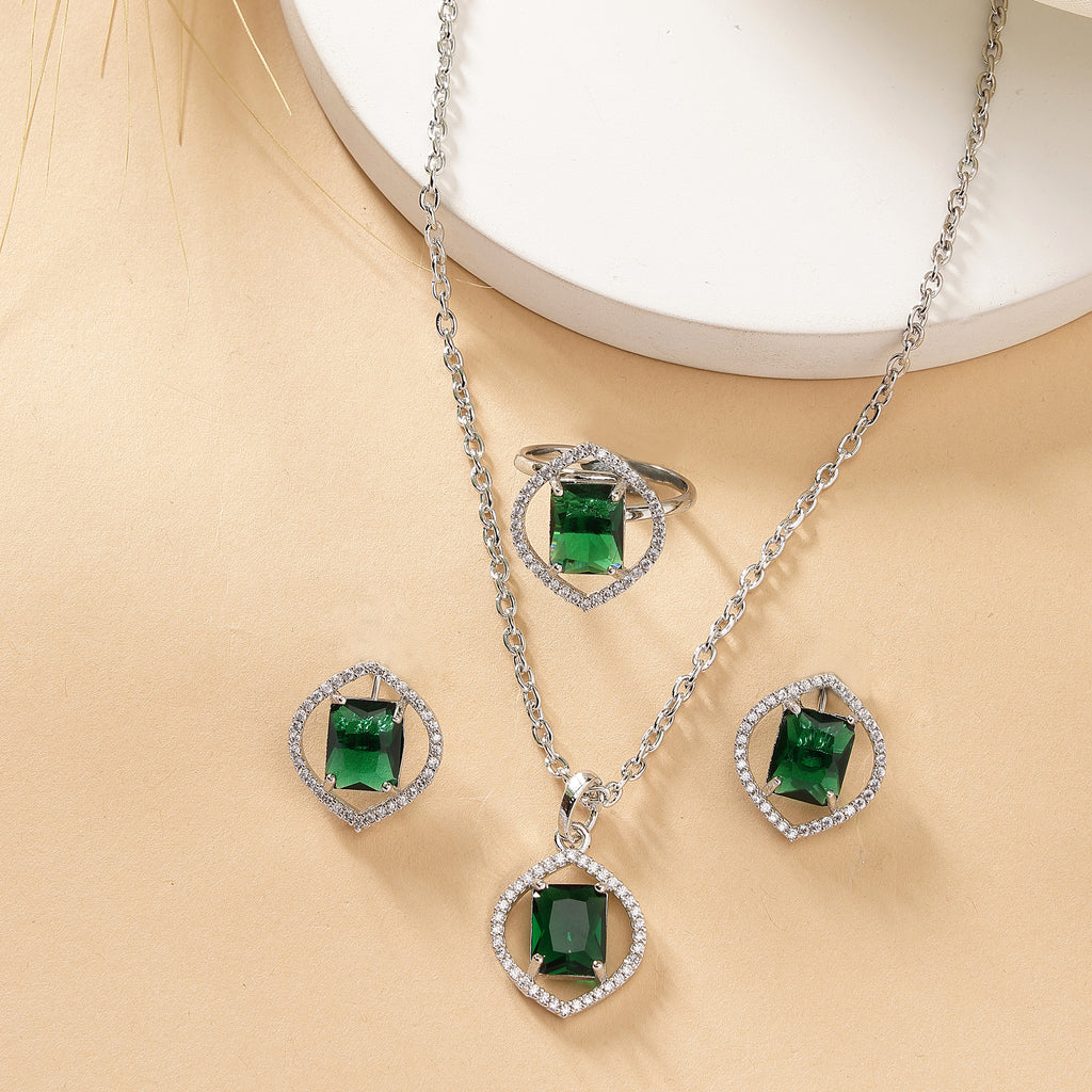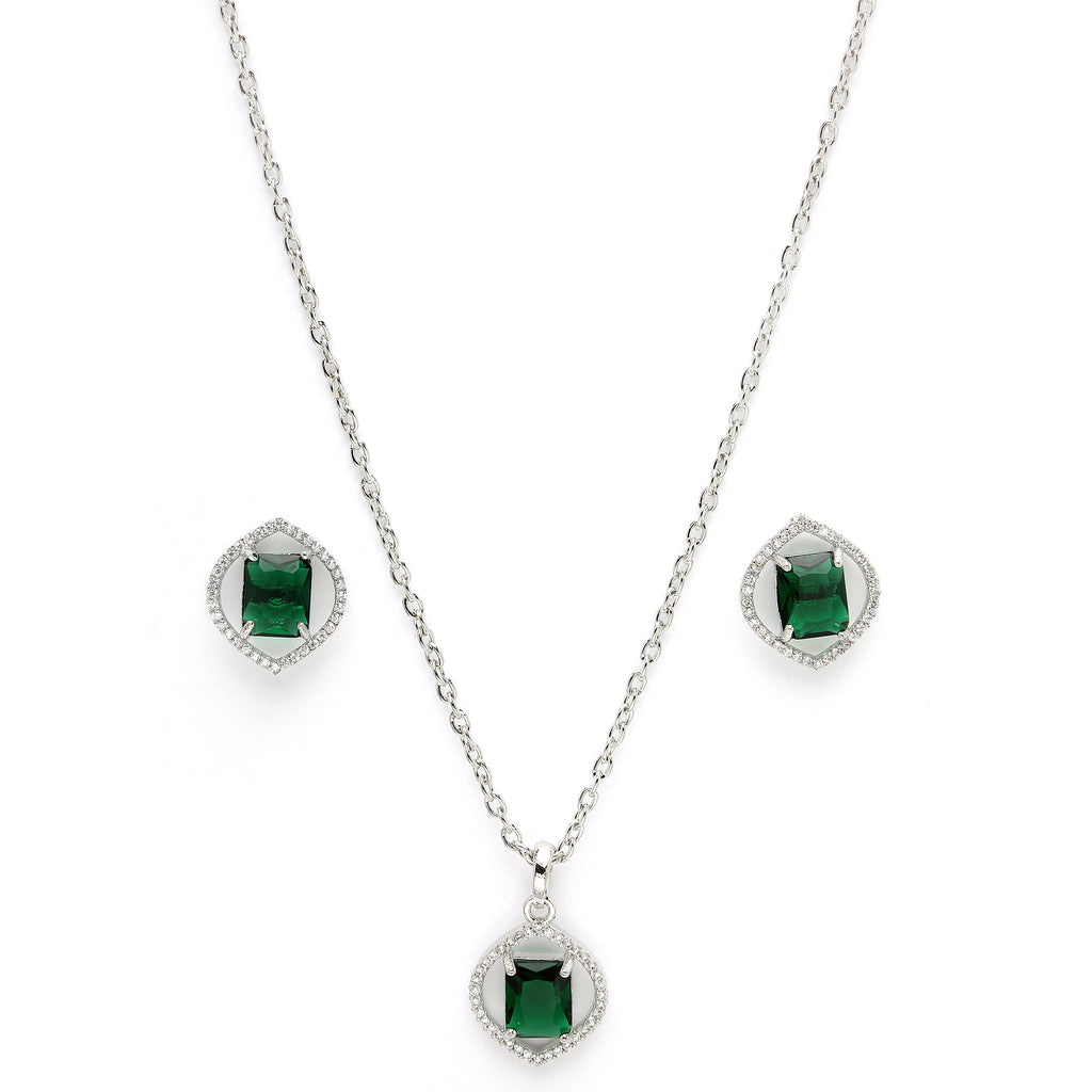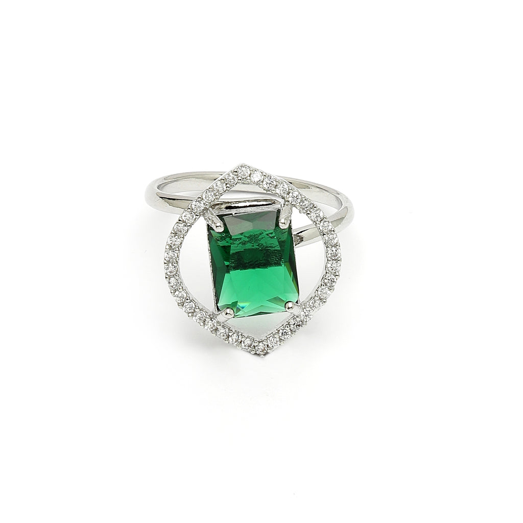 Elegant Design : This rhodium-plated  with Green gemstone at its core for a harmonized and stylish look. Surrounding the gemstone is a halo of shimmering white stones, adding a touch of brilliance and sophistication