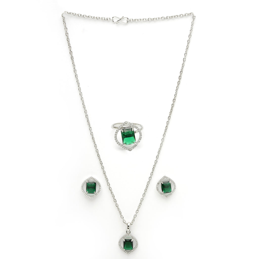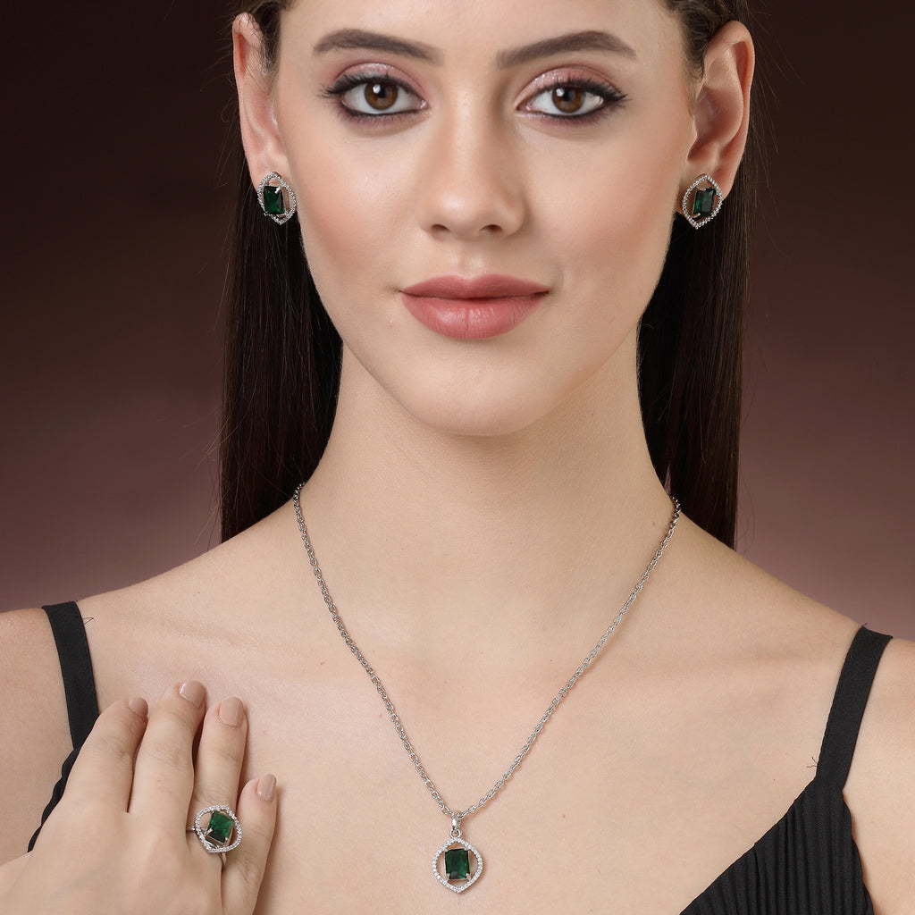 Rhodium Plated Silver Toned Green American Diamond Studded Pendant Combo With Ring