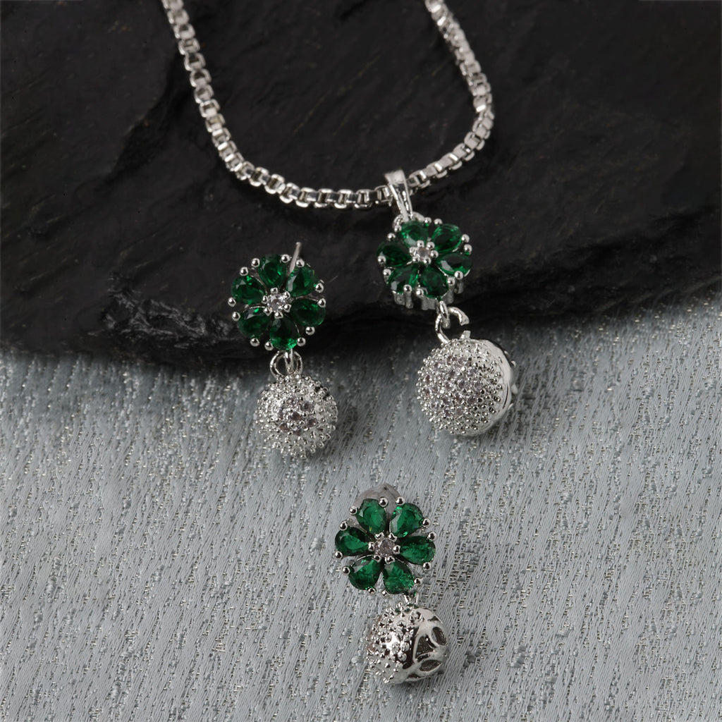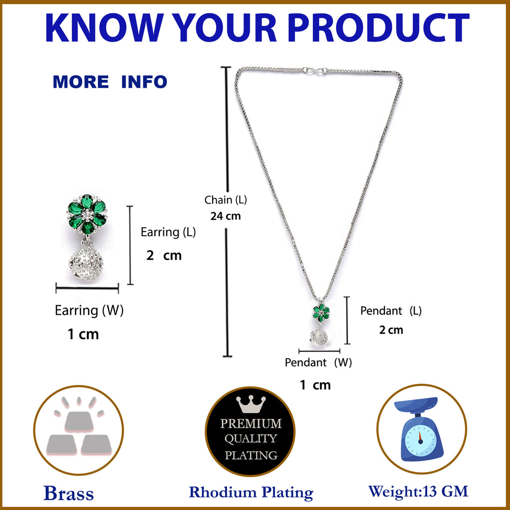 Rhodium-Plated Silver Toned Green Cubic Zirconia studded Floral Shaped Cute Pendant with Earrings