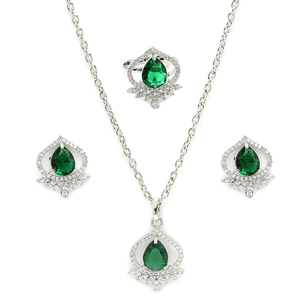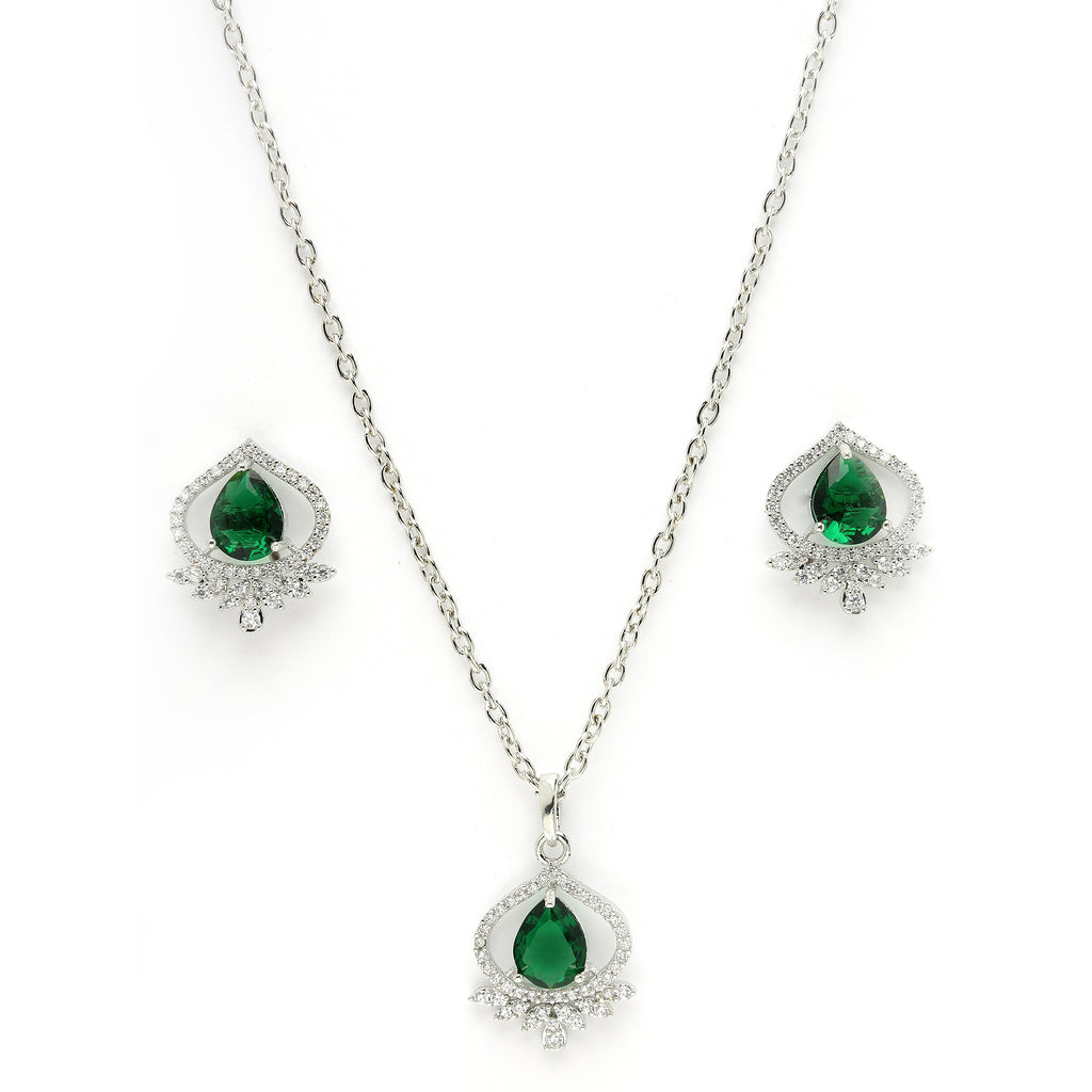 Elegant Tear Drop Motif: This rhodium-plated teardrop-shaped design with Green gemstone at its core, symbolizing elegance and royalty. Surrounding the gemstone is a halo of shimmering white stones, adding a touch of brilliance and sophistication