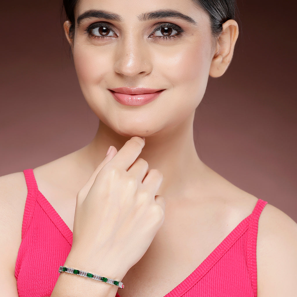 Elegant Design: This rhodium-plated bracelet features a stunning combination of green and white American diamond studs, adding a sophisticated and luxurious touch.