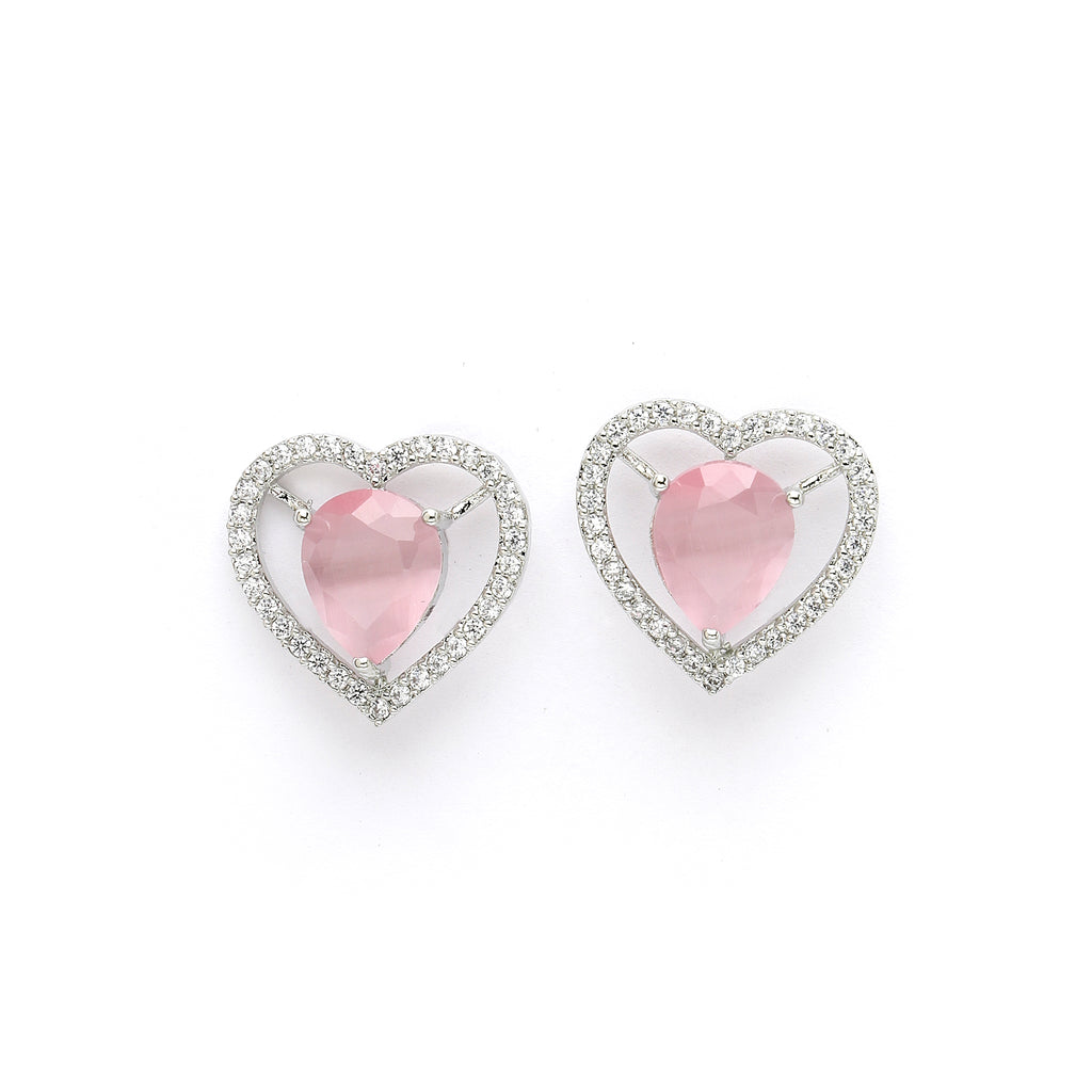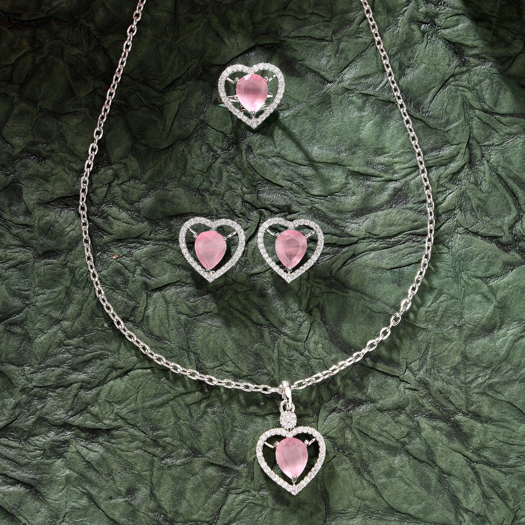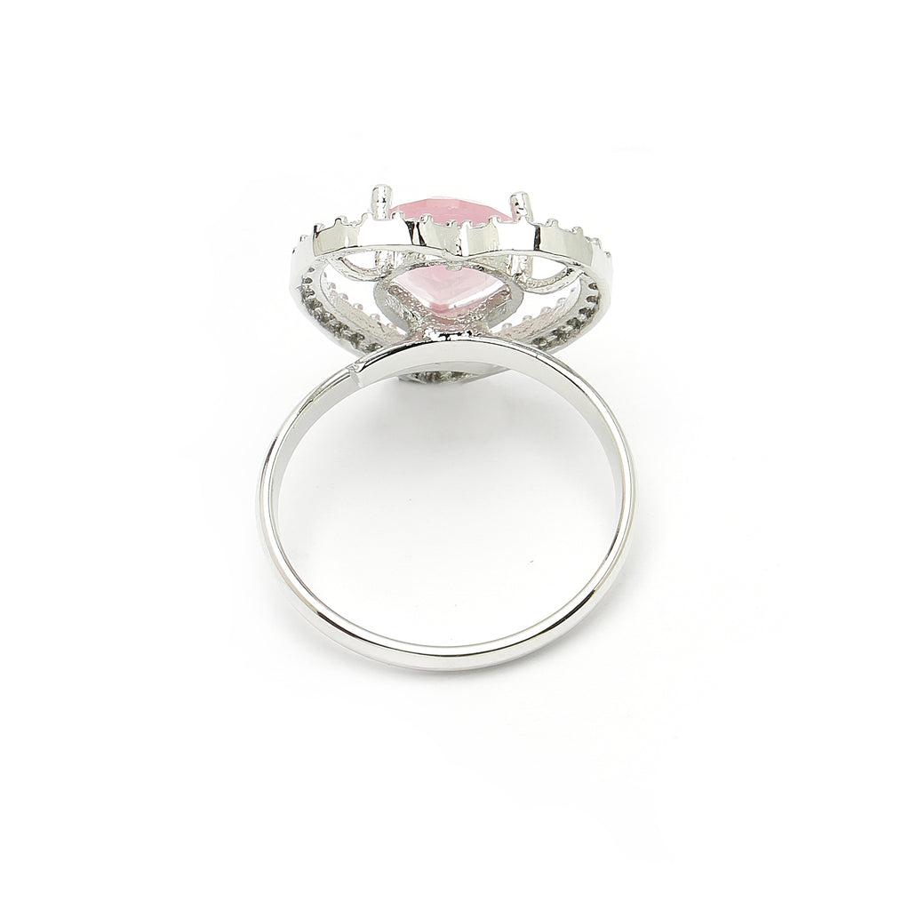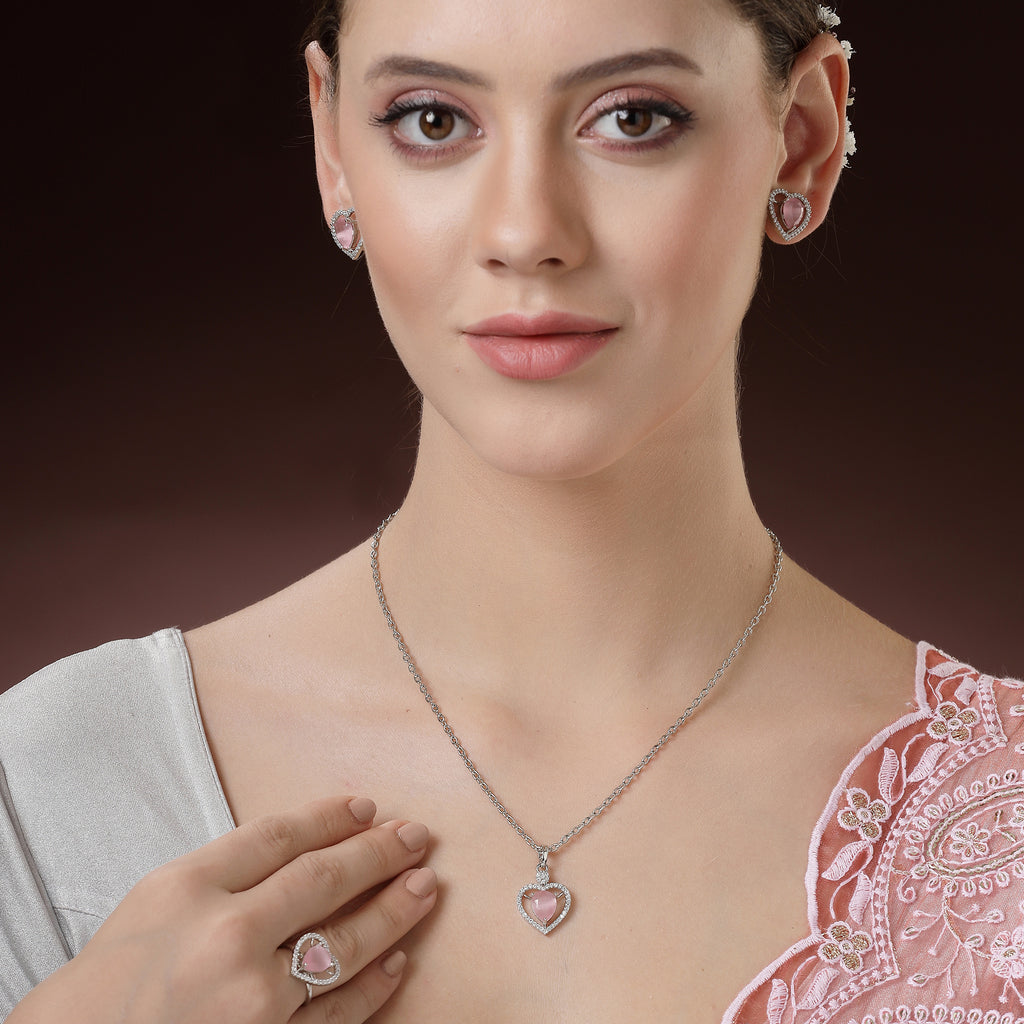 Heart Shaped Design : This rhodium-plated with Subtle Pink gemstone at its core for a harmonized and stylish look. Surrounding the gemstone is a halo of shimmering white stones, adding a touch of brilliance and sophistication