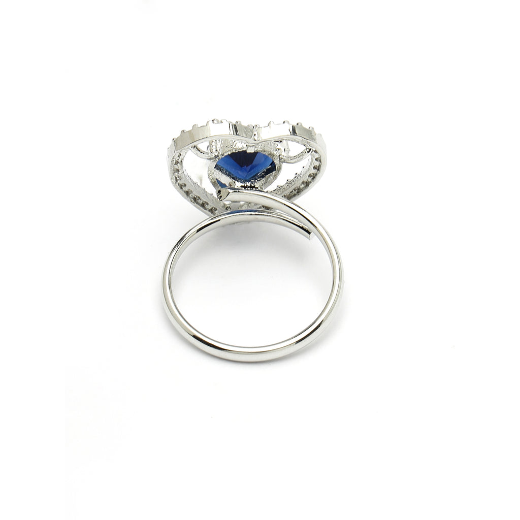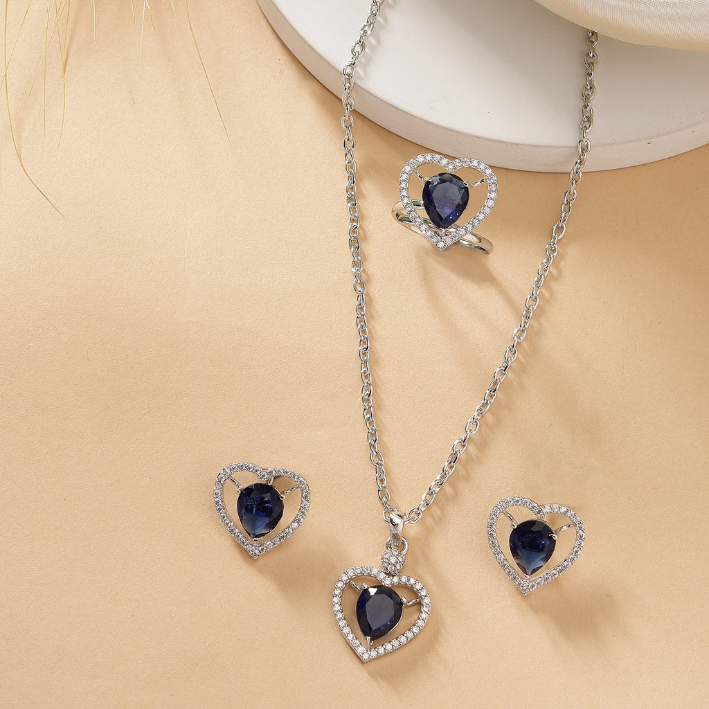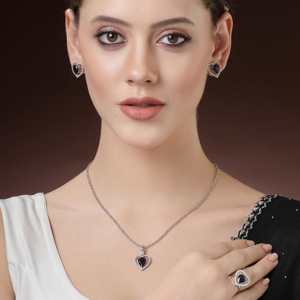 Heart Shaped Design : This rhodium-plated with Royal Blue gemstone at its core for a harmonized and stylish look. Surrounding the gemstone is a halo of shimmering white stones, adding a touch of brilliance and sophistication