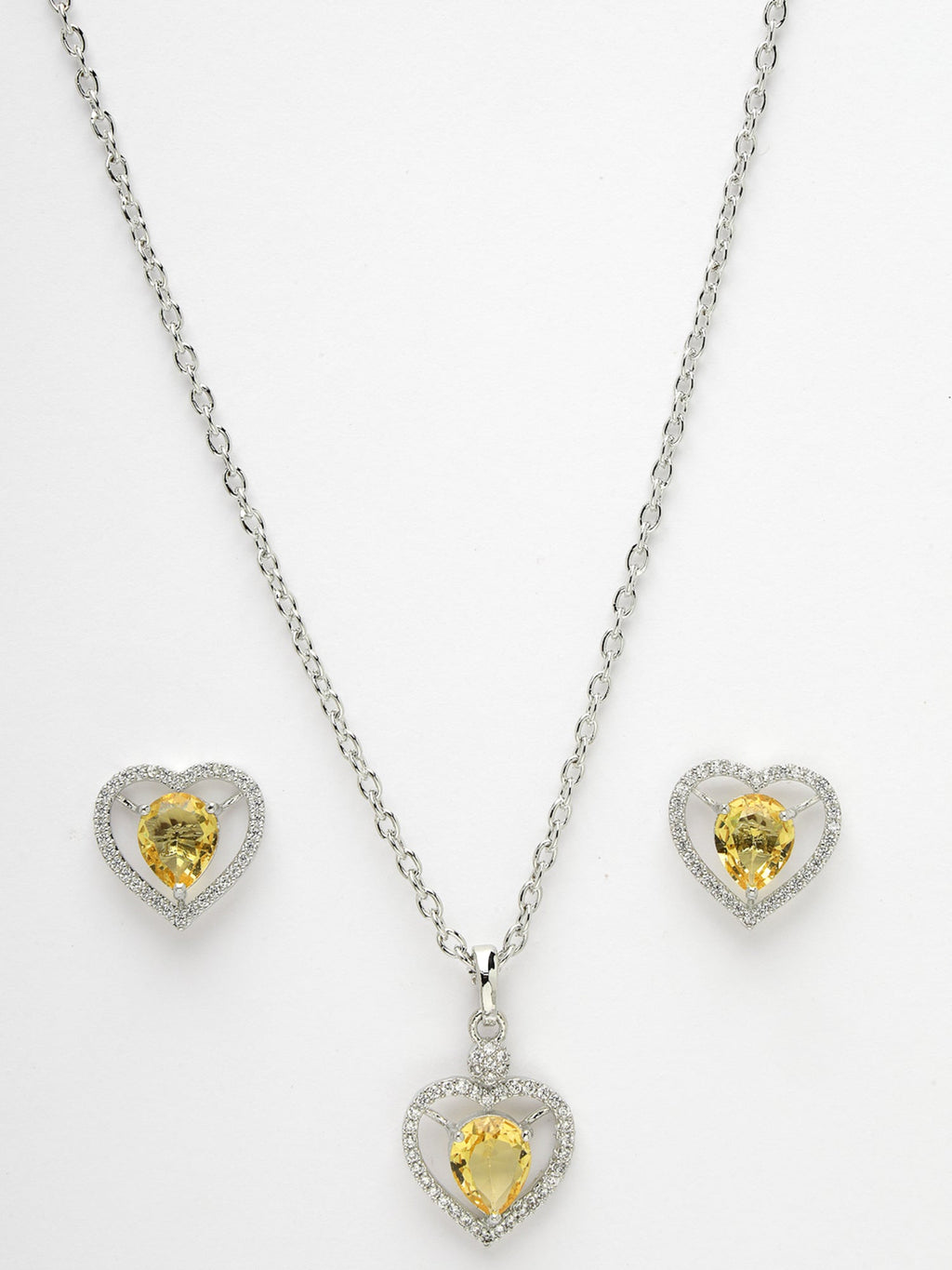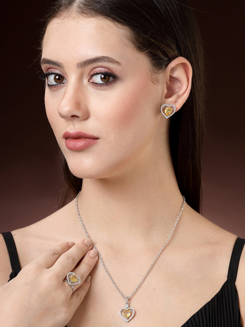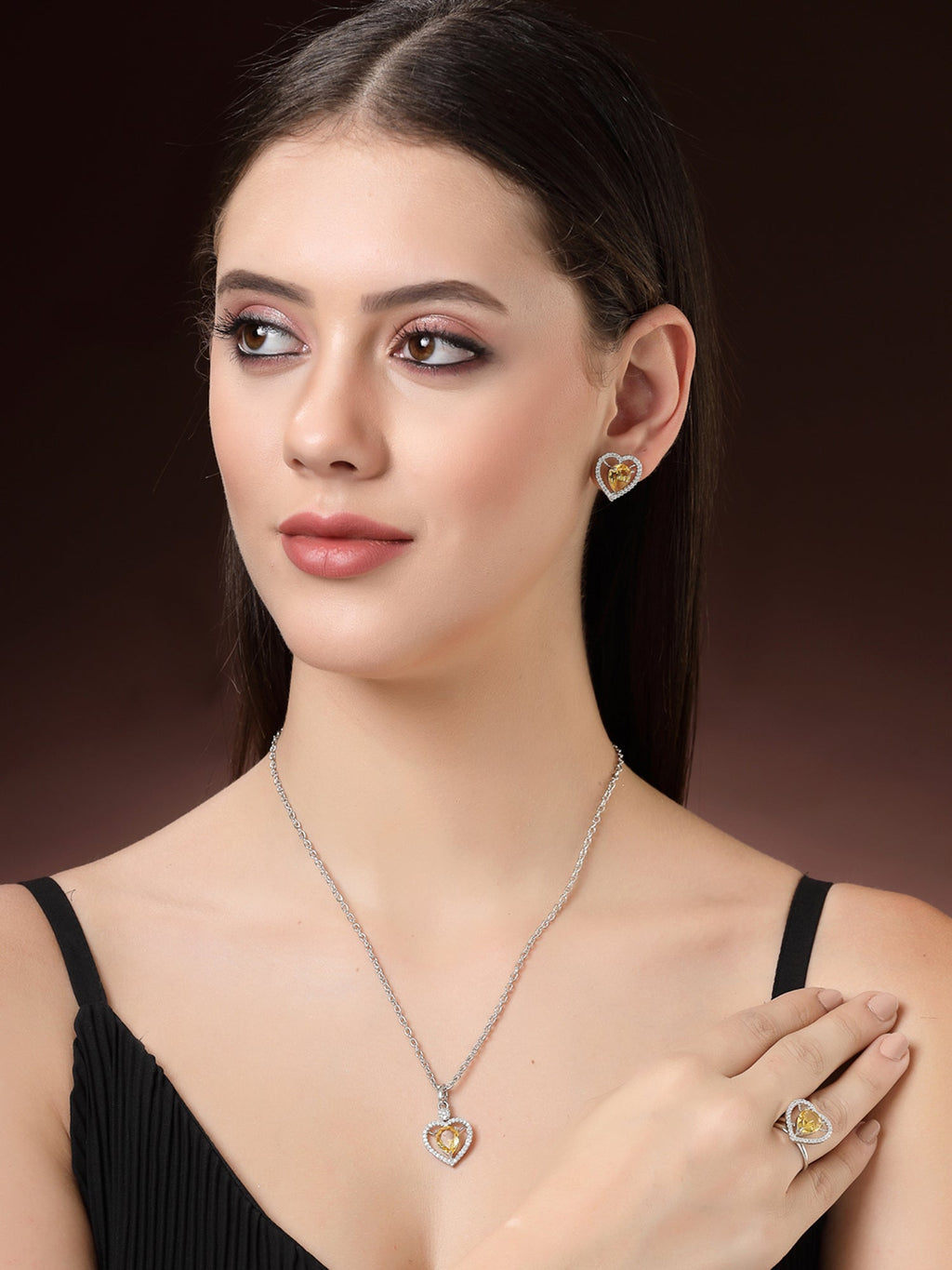 Heart Shaped Design : This rhodium-plated with Yellow gemstone at its core for a harmonized and stylish look. Surrounding the gemstone is a halo of shimmering white stones, adding a touch of brilliance and sophistication