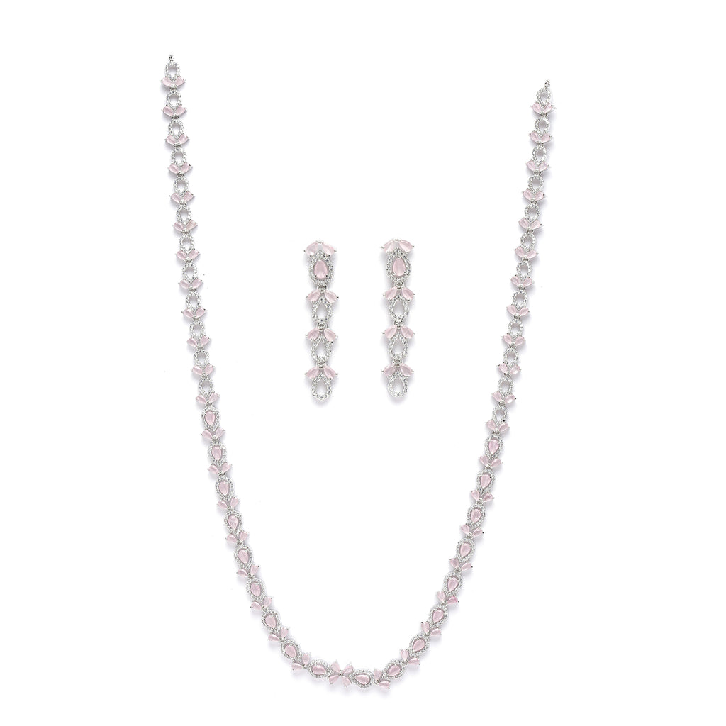 This jewellery set consists of a necklace and a pair of earrings. Rhodium-Plated pink and white american diamond studded long necklace, has secured with hook closure. A pair of matching drop earrings, each secured with a post and back closure.