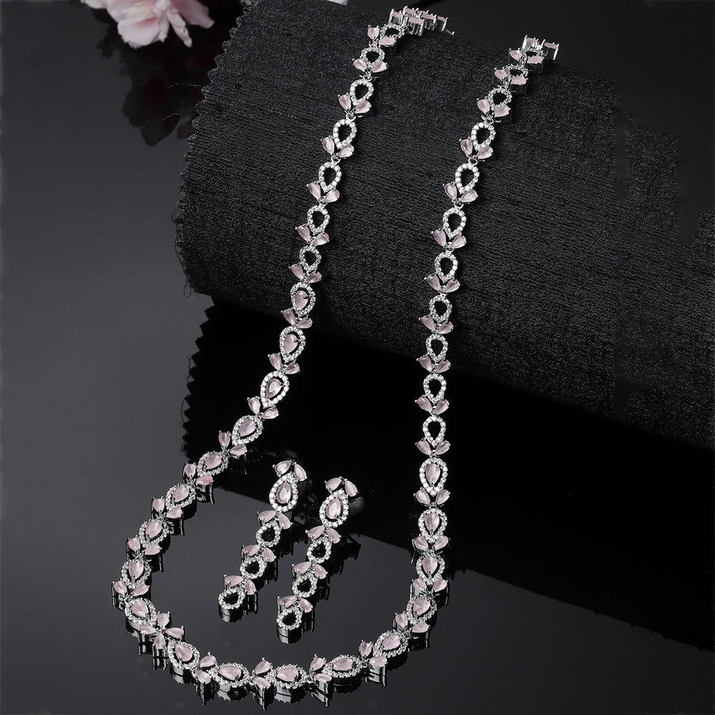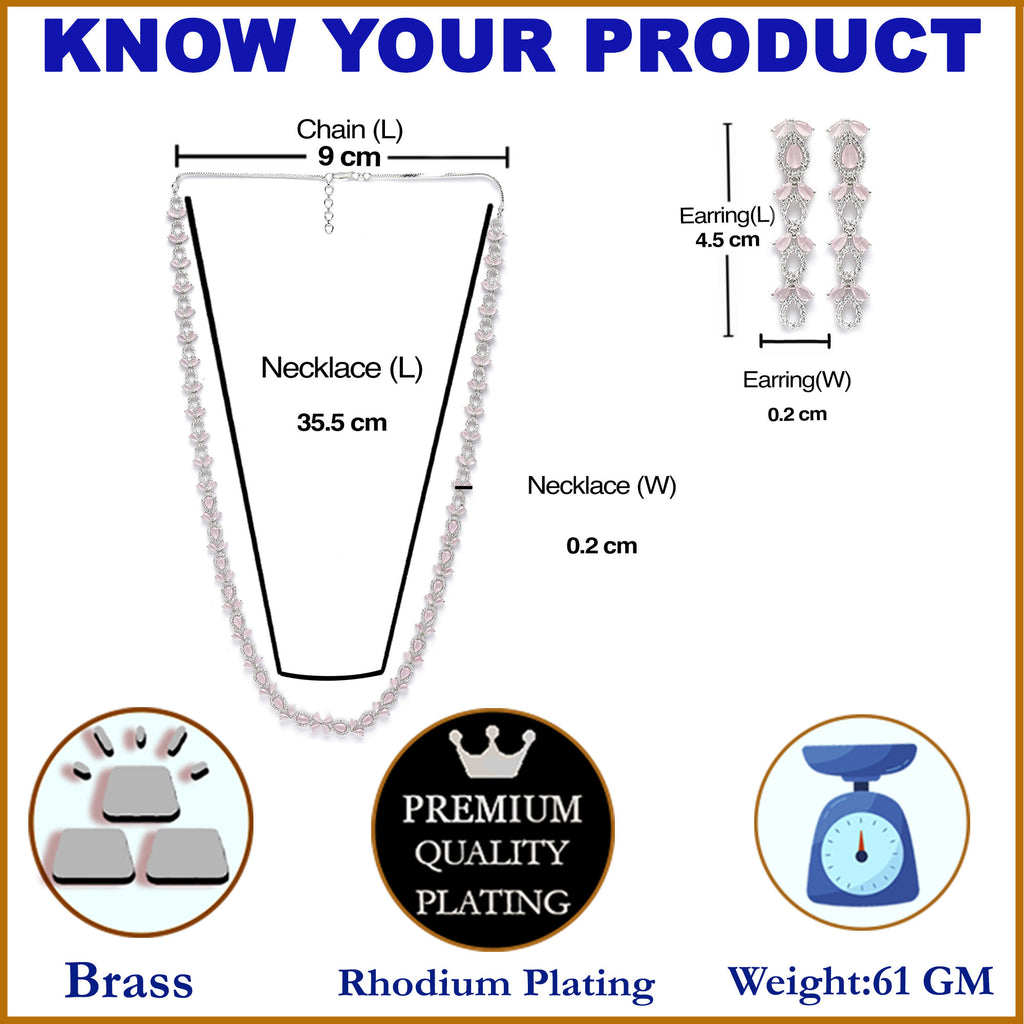 Rhodium-Plated Silver Toned Leaf Pink American Diamond Studded Long Necklace with Drop Earrings Jewellery Set