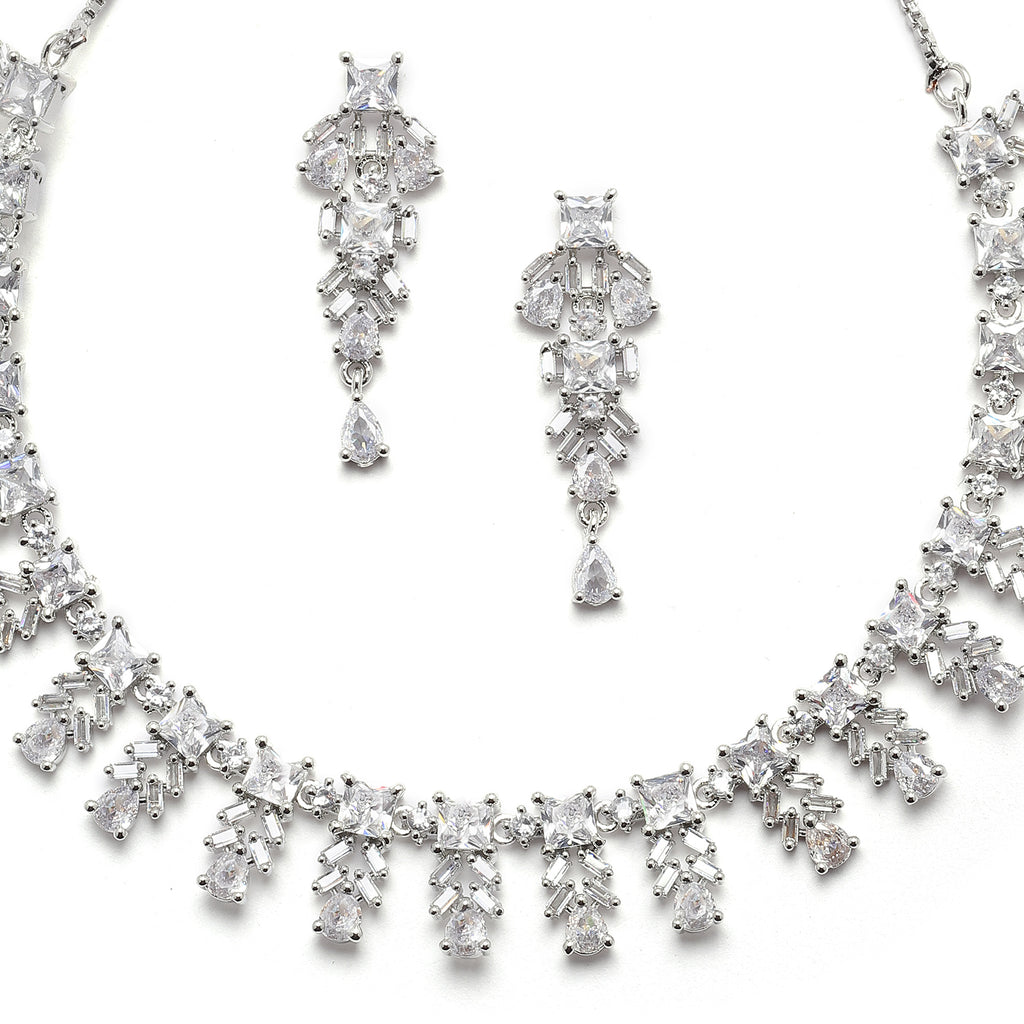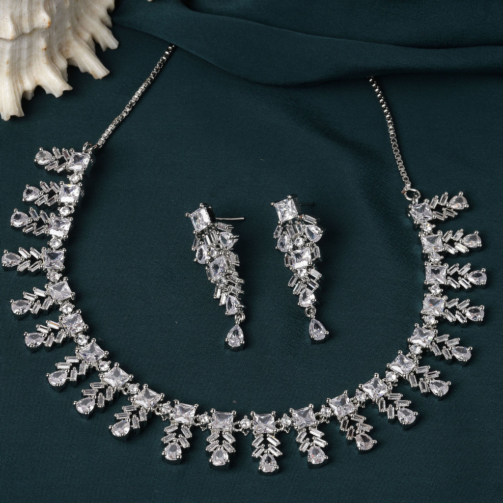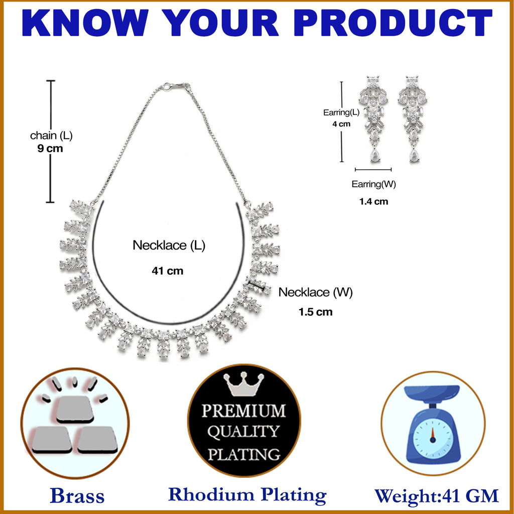 Rhodium-Plated Silver Toned Leaf White American Diamond Studded Necklace with Earrings Jewellery Set