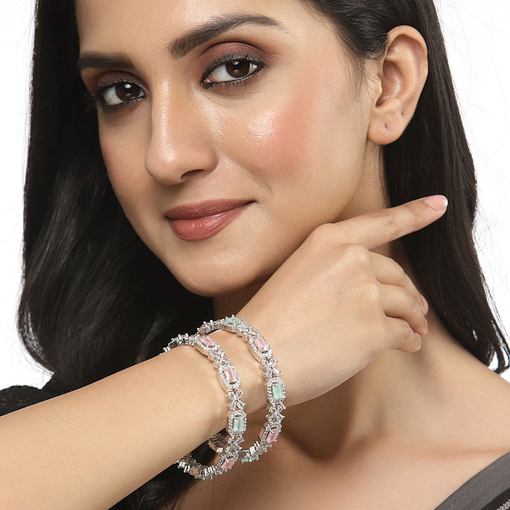 Rhodium-Plated Silver Toned Lime Green & Pink American Diamond Square Shaped studded Bangle Jewelry Set (Set Of 2)