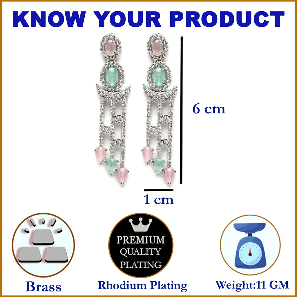 Rhodium-Plated Silver Toned Sea Green & Pink American Diamond studded Crescent Shaped Drop Earrings