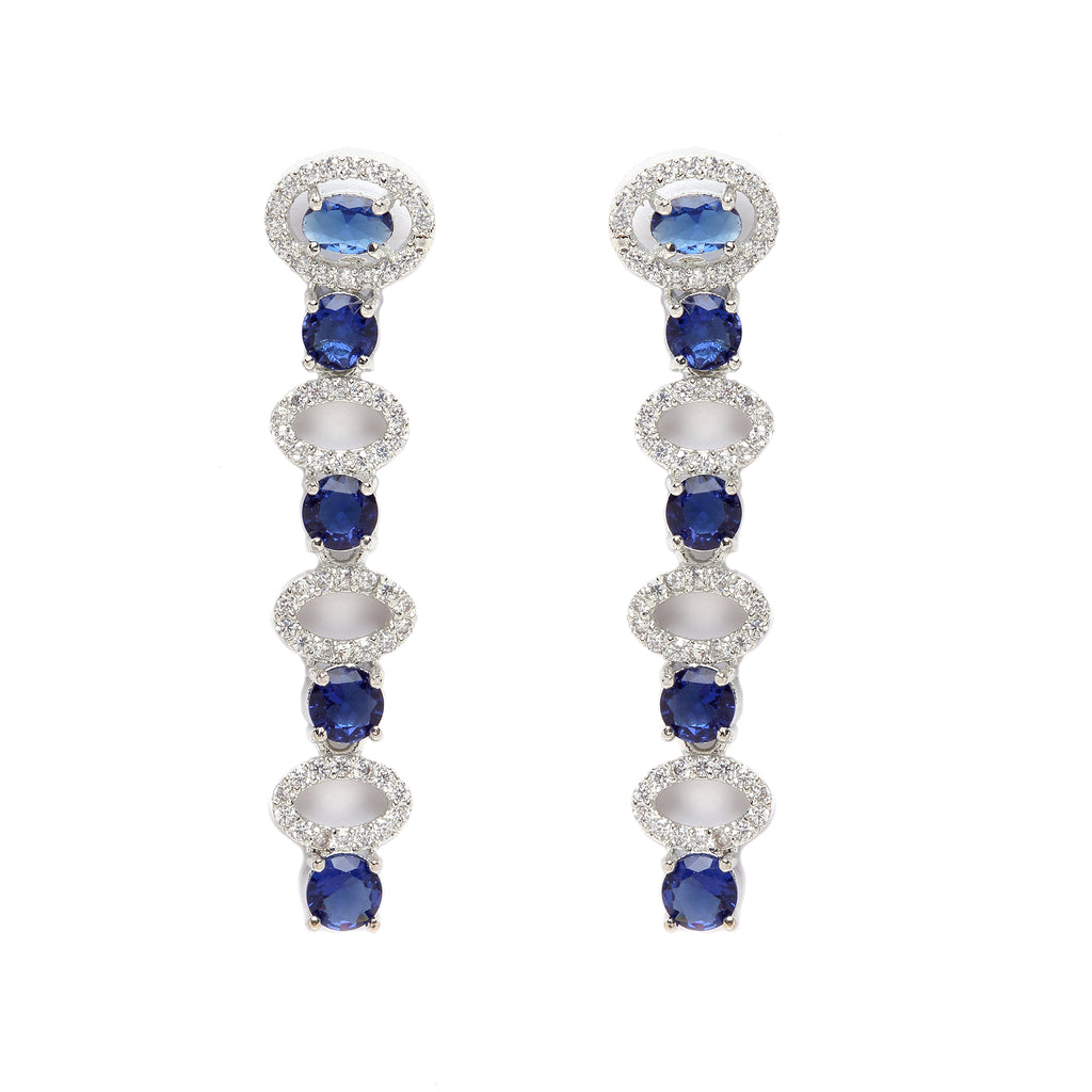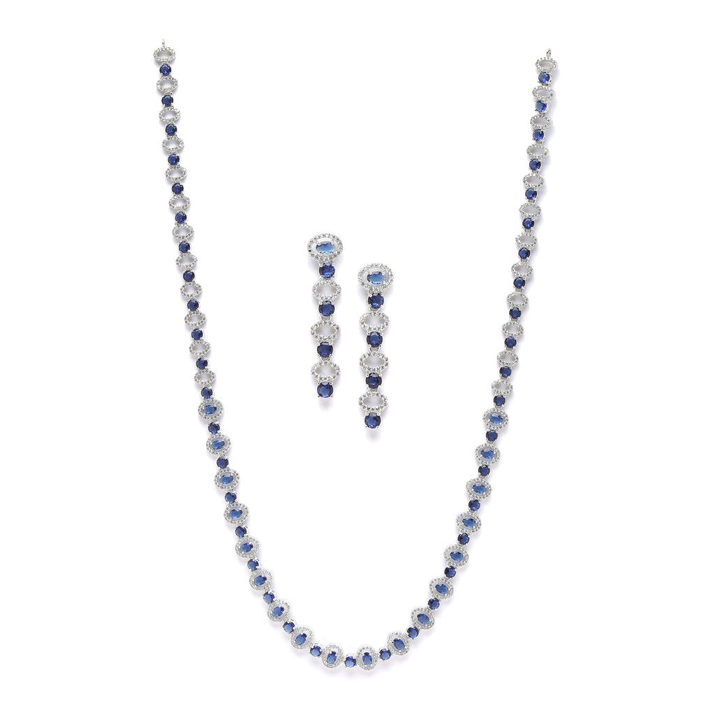 Rhodium-Plated Silver Toned Oval Navy Blue American Diamond Long Necklace with Earrings Jewellery Set