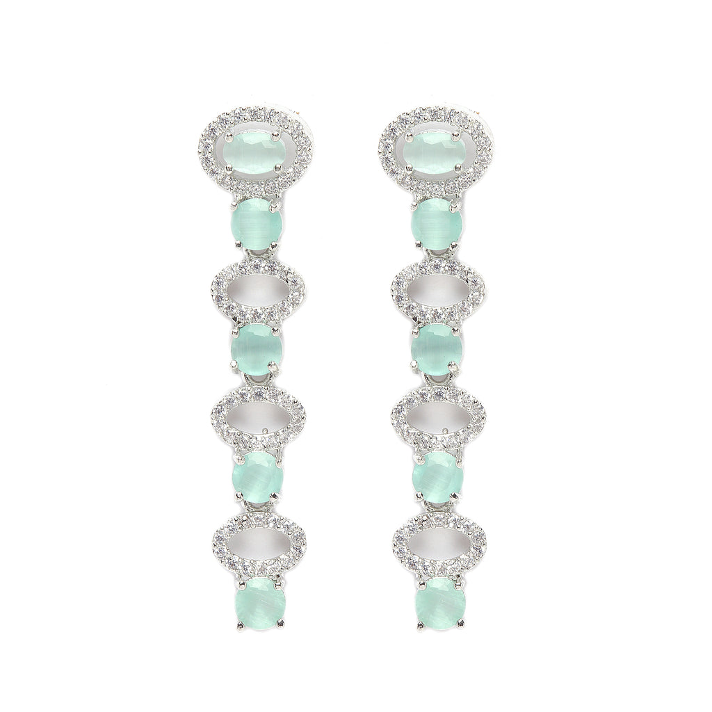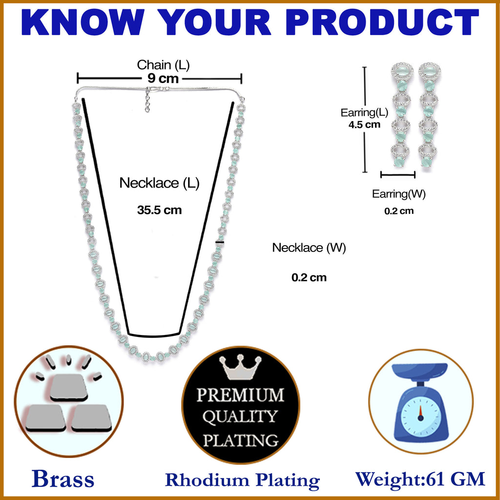 Rhodium-Plated Silver Toned Oval Sea Green American Diamond Long Necklace with Drop Earrings Jewellery Set