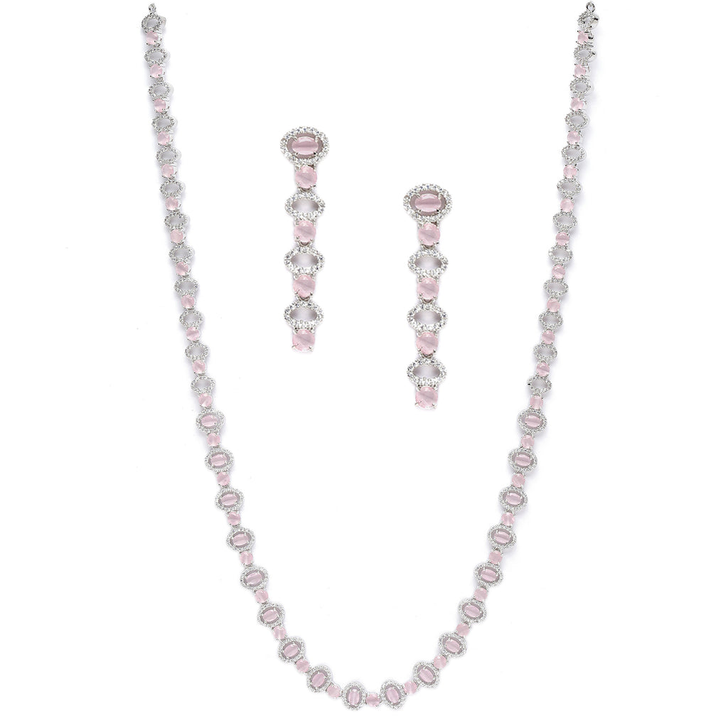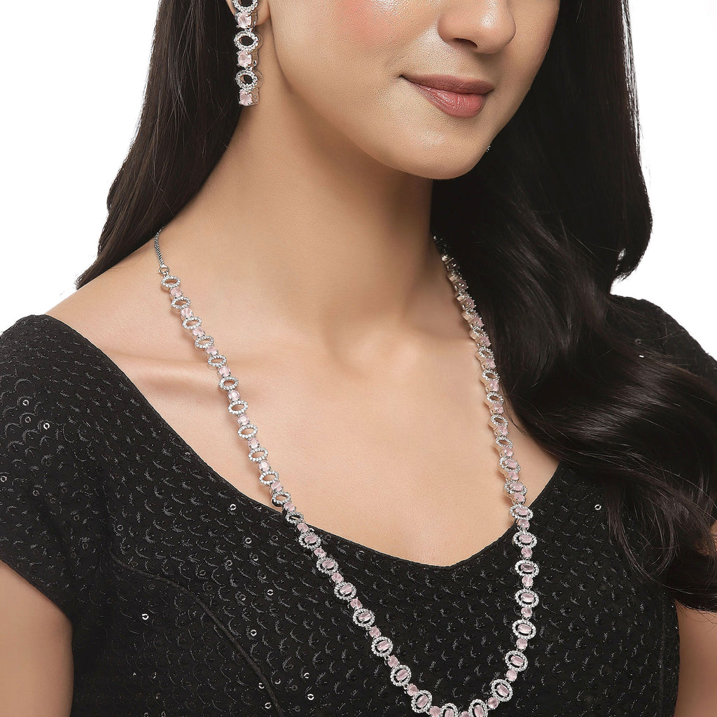 Rhodium-Plated Silver Toned Oval Pink American Diamond Long Necklace with Drop Earrings Jewellery Set
