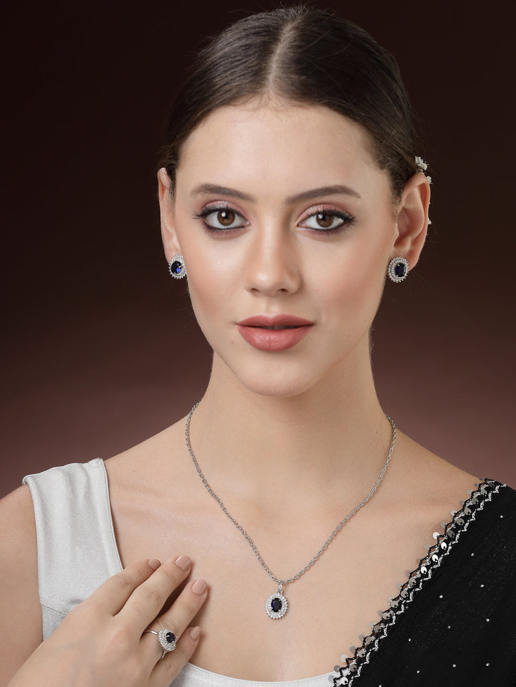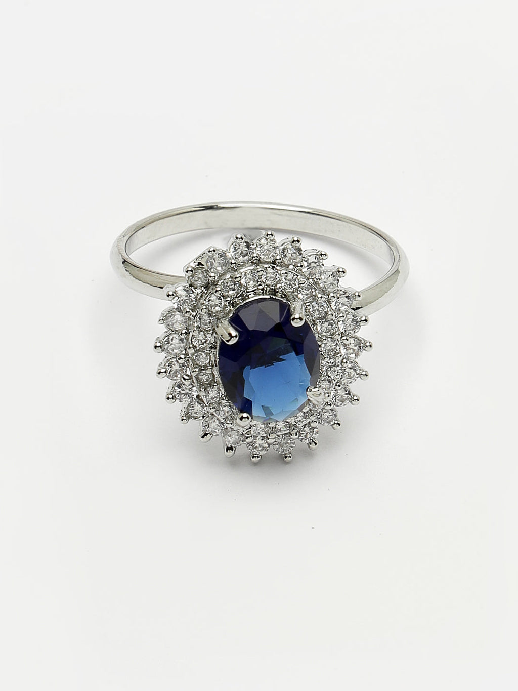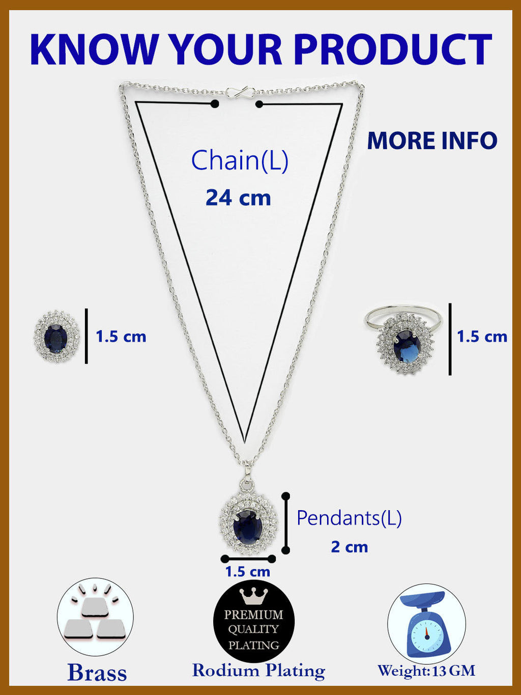 Elegant Design: This rhodium-plated with Blue gemstone at its core for a harmonized and stylish look. Surrounding the gemstone is a halo of shimmering white stones, adding a touch of brilliance and sophistication
