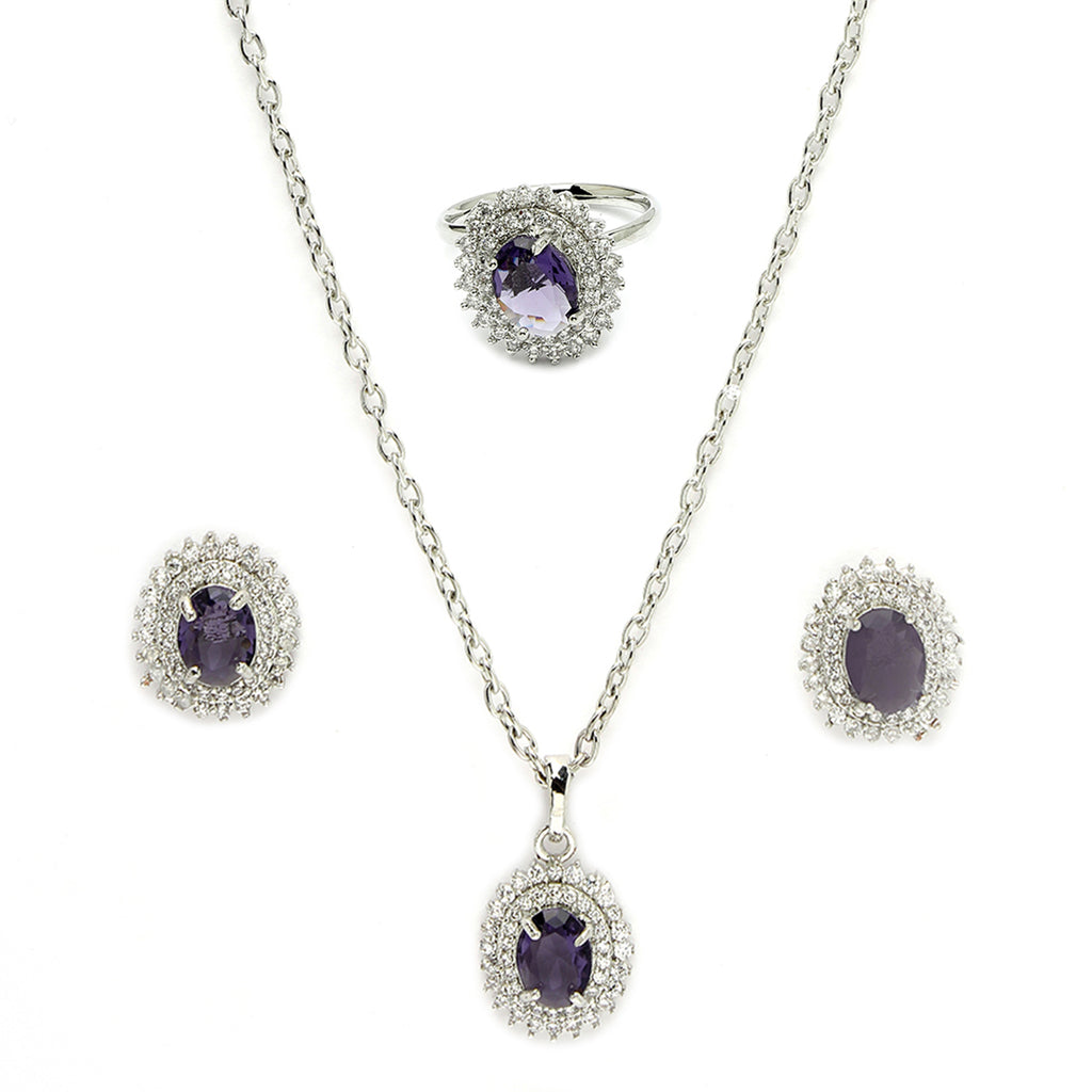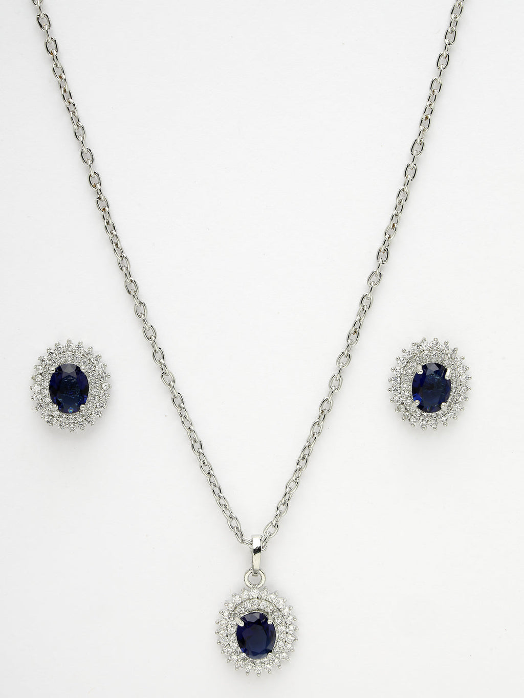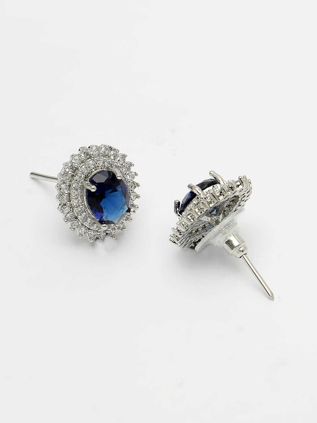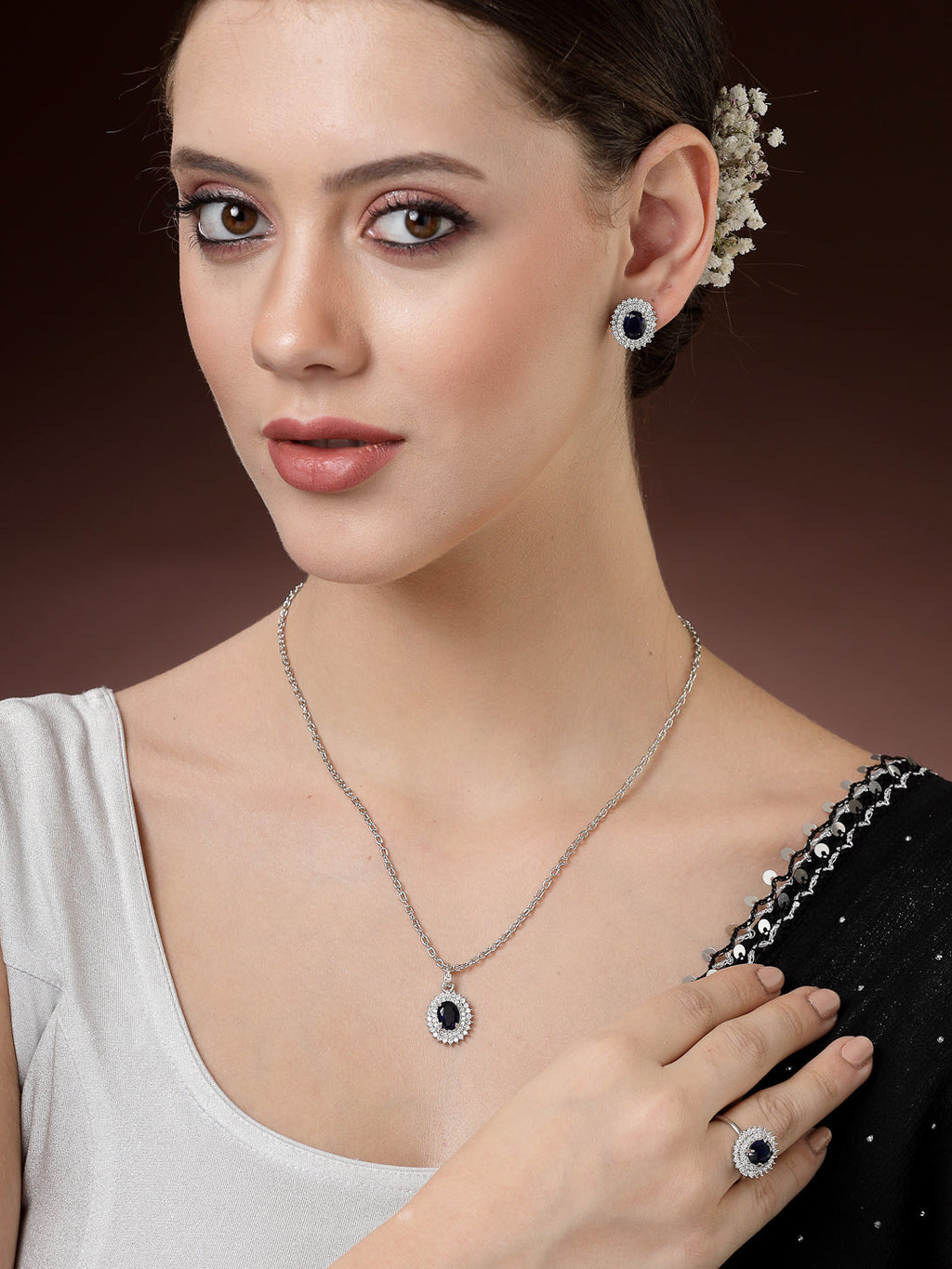 Elegant Design: This rhodium-plated with Blue gemstone at its core for a harmonized and stylish look. Surrounding the gemstone is a halo of shimmering white stones, adding a touch of brilliance and sophistication