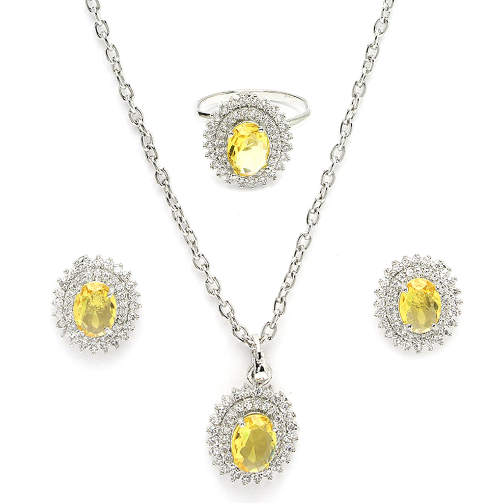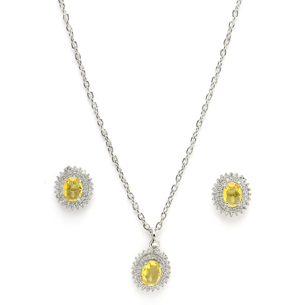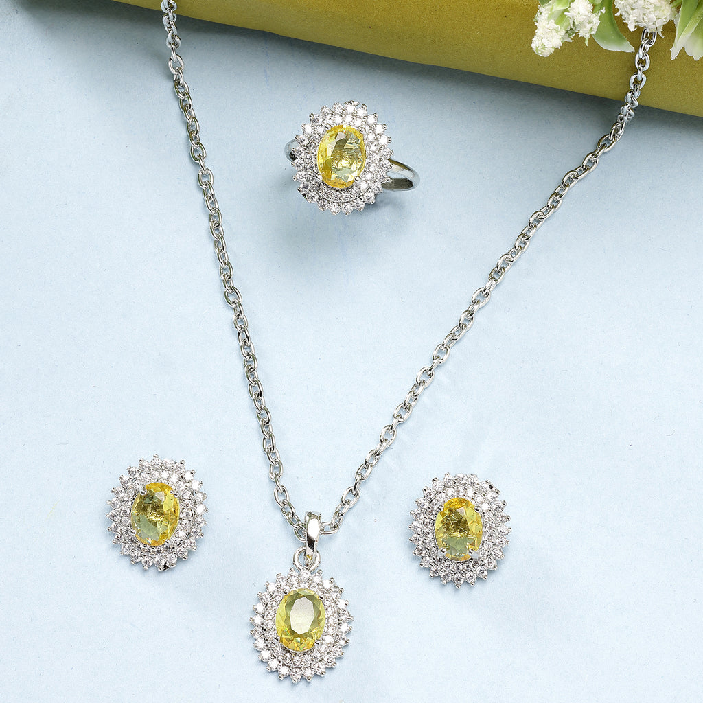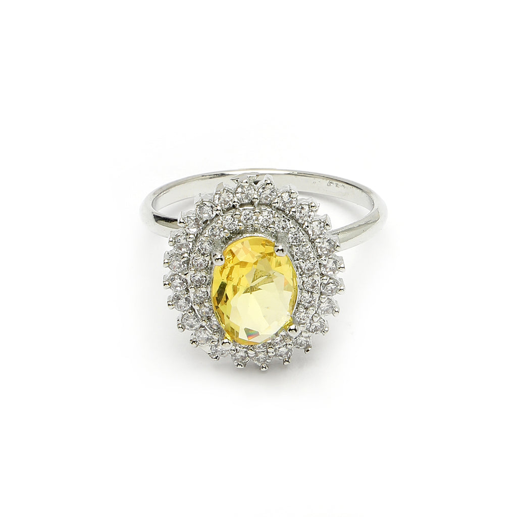 Elegant Design: This rhodium-plated with Yellow gemstone at its core for a harmonized and stylish look. Surrounding the gemstone is a halo of shimmering white stones, adding a touch of brilliance and sophistication