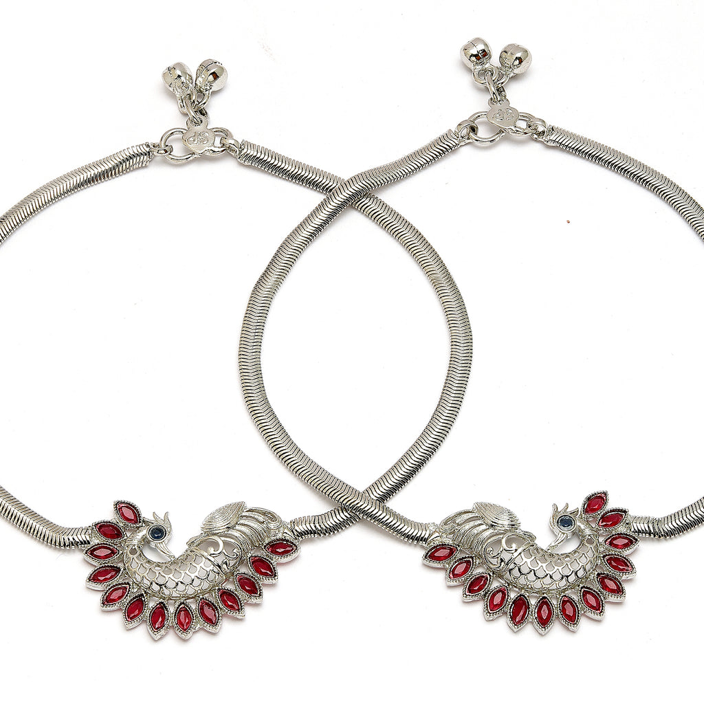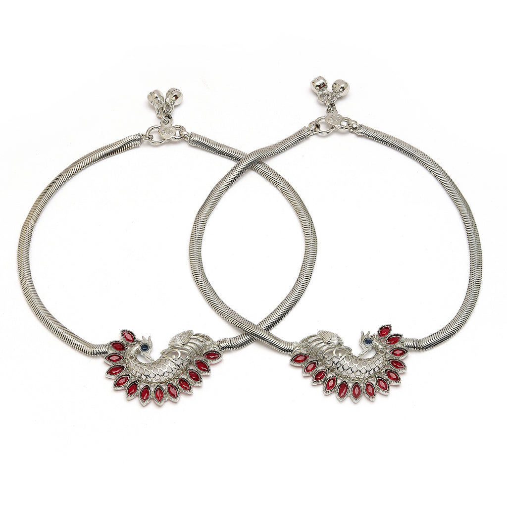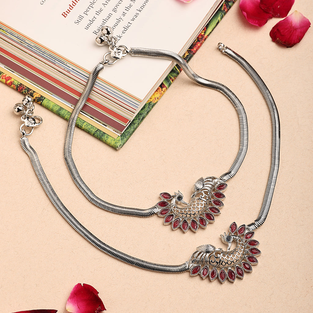 Elegant Design: The intricate feather detailing and a striking peacock-inspired motif, adorned with vibrant red stones for a regal touch.