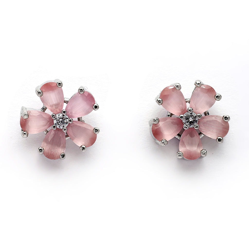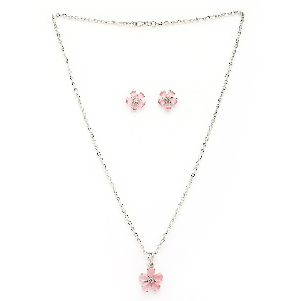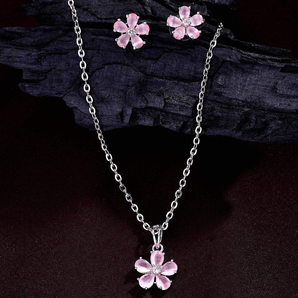 Elegant Design: This rhodium-plated silver toned American Diamond studded floral shaped Pendant set with a pair of matching earrings boasts a sophisticated Trendy design, exuding timeless elegance.