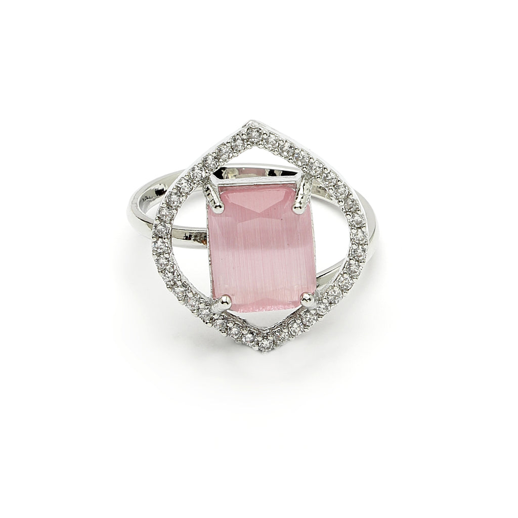 Elegant Design : This rhodium-plated  with Pink gemstone at its core for a harmonized and stylish look. Surrounding the gemstone is a halo of shimmering white stones, adding a touch of brilliance and sophistication