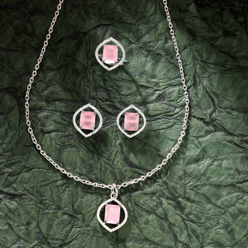 Rhodium Plated Silver Toned Pink American Diamond Studded Pendant Combo With Ring
