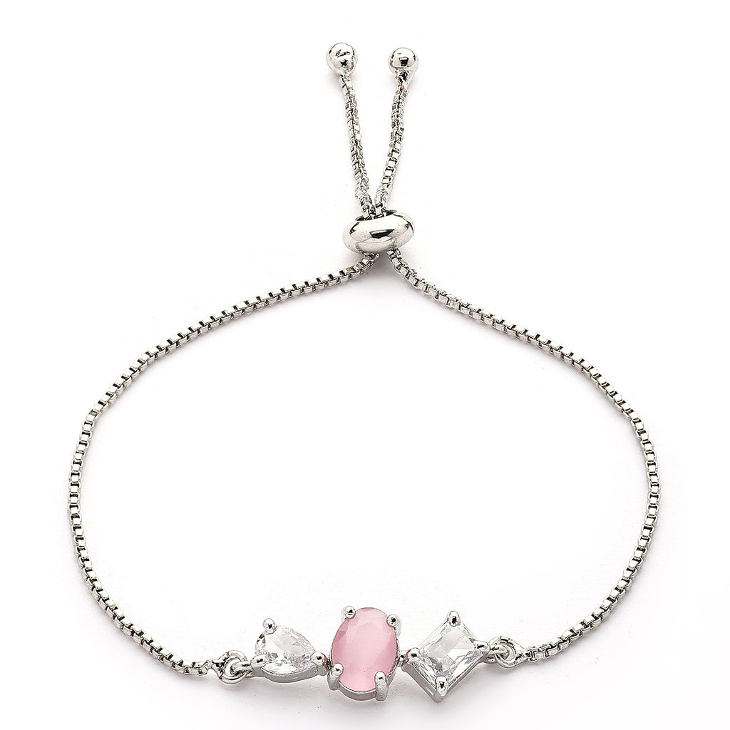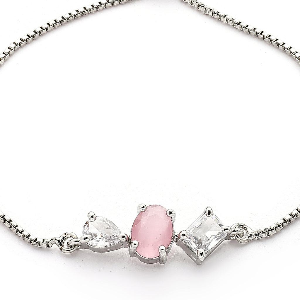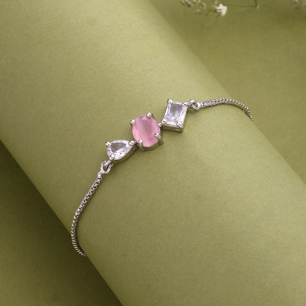 Elegant Drop Shape Design: This rhodium-plated wraparound bracelet showcases sparkling pink and white American diamonds in a geometric shape, adding a touch of sophistication to your look.