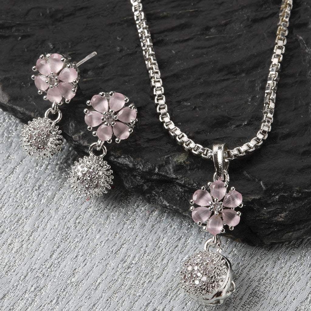 Rhodium-Plated Silver Toned Pink Cubic Zirconia studded Floral Shaped Cute Pendant with Earrings