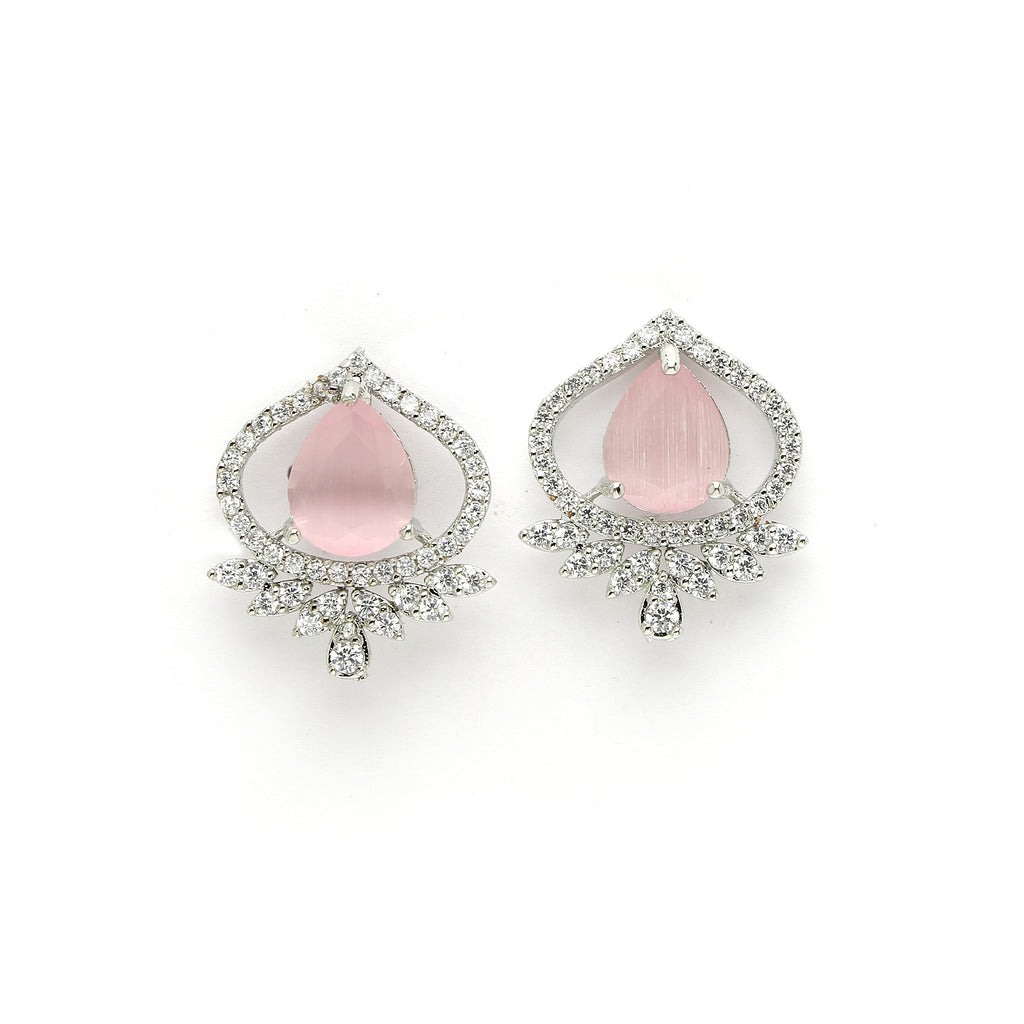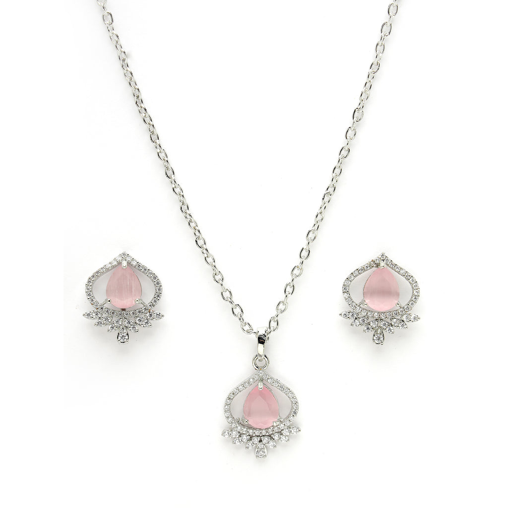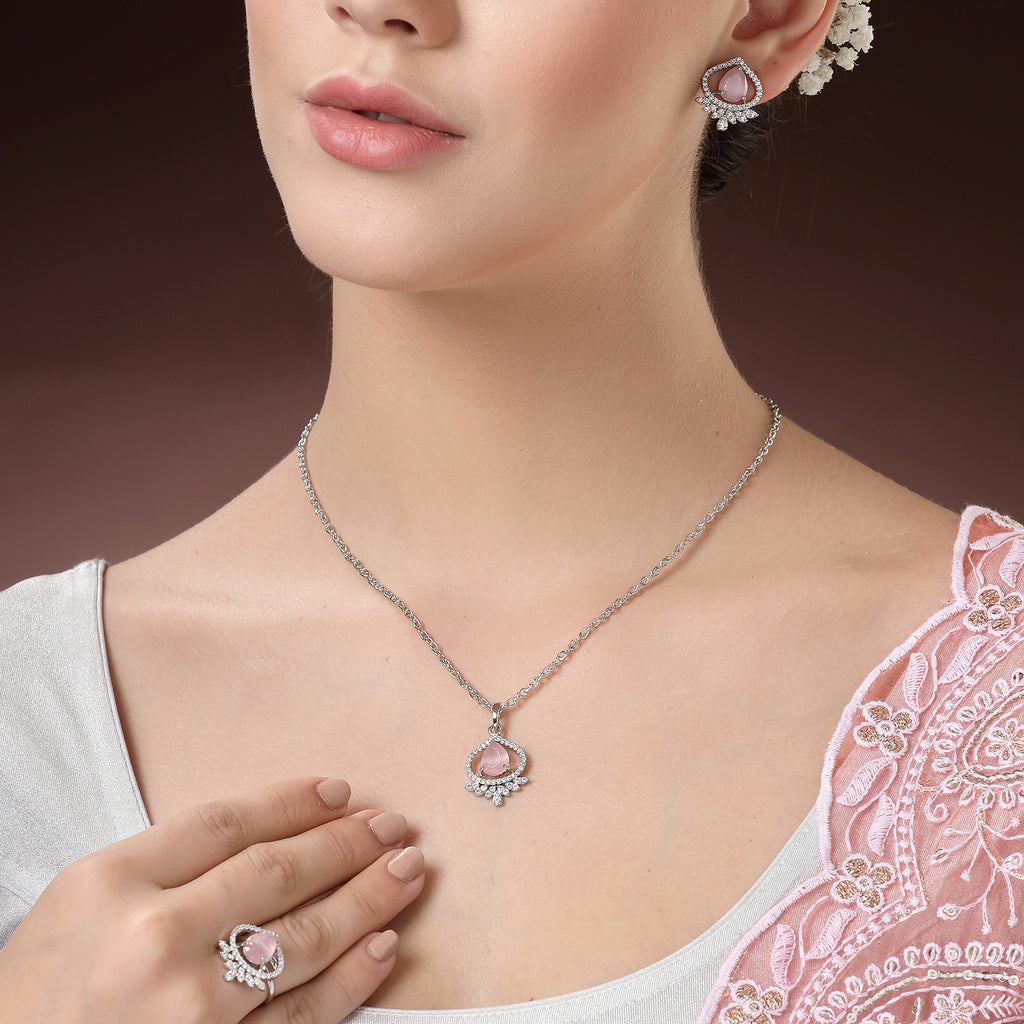 Elegant Tear Drop Motif: This rhodium-plated teardrop-shaped design with Pink gemstone at its core, symbolizing elegance and royalty. Surrounding the gemstone is a halo of shimmering white stones, adding a touch of brilliance and sophistication